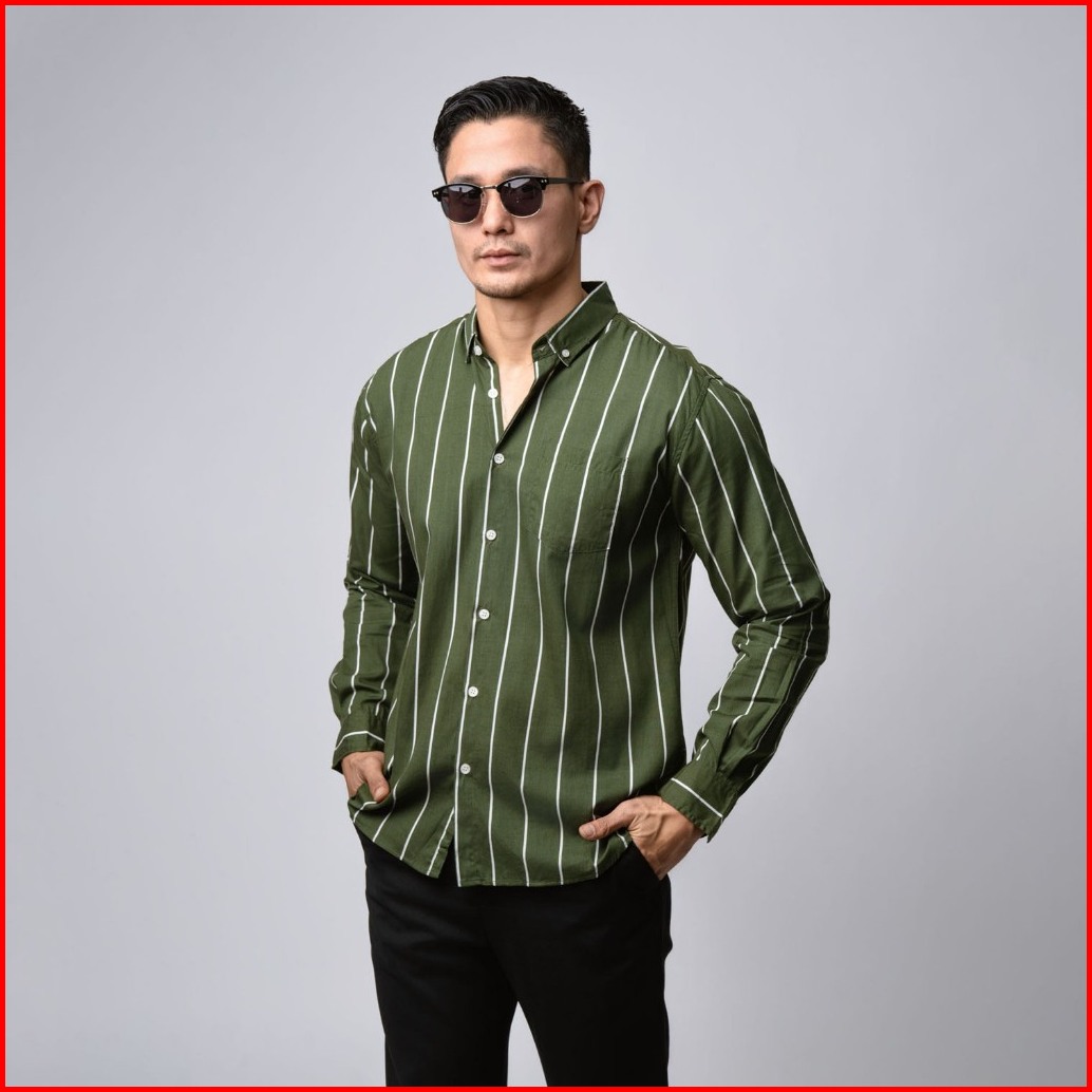 Vengoz Atasan Kemeja Pria Slim Fit - Vicente Stripe Army Green Ls