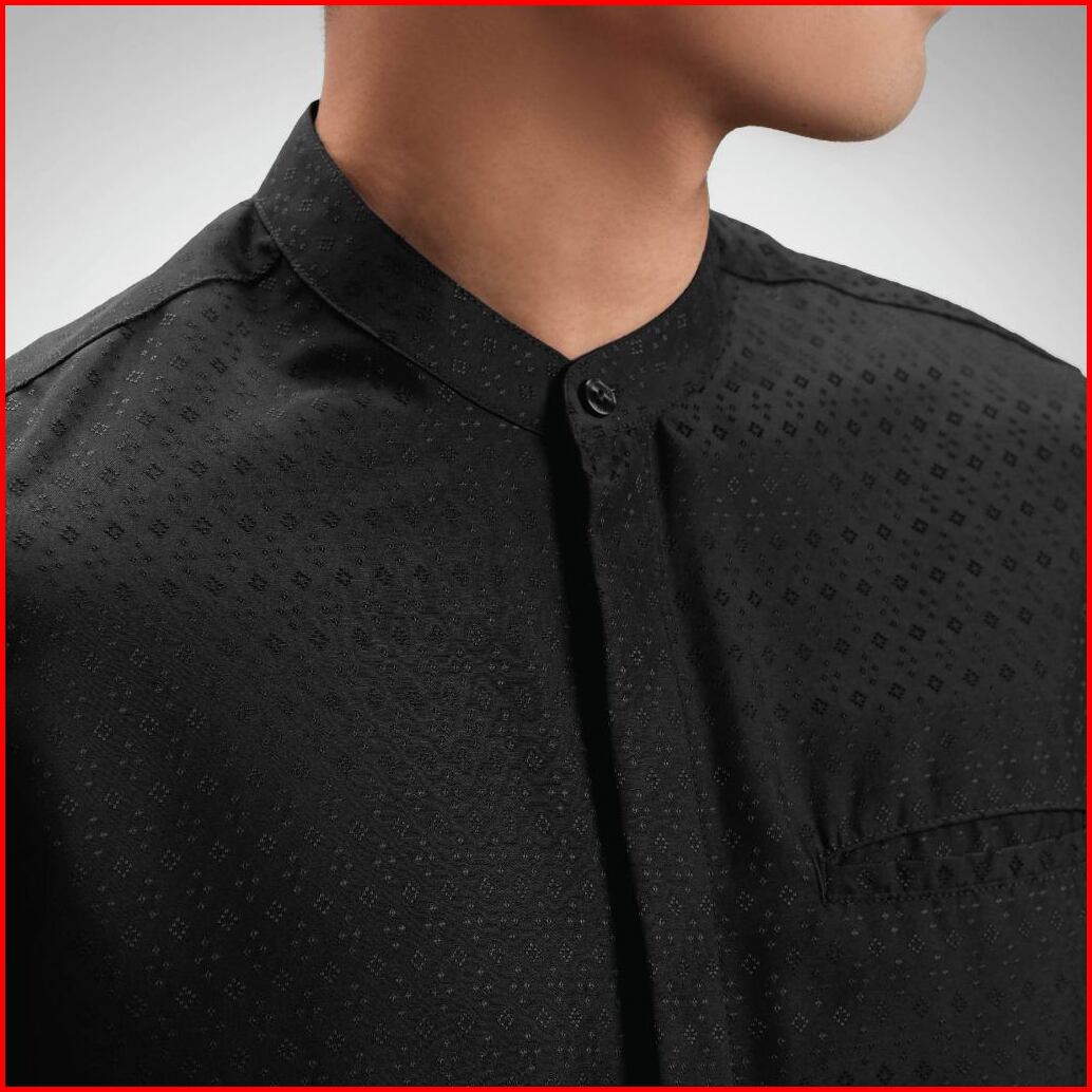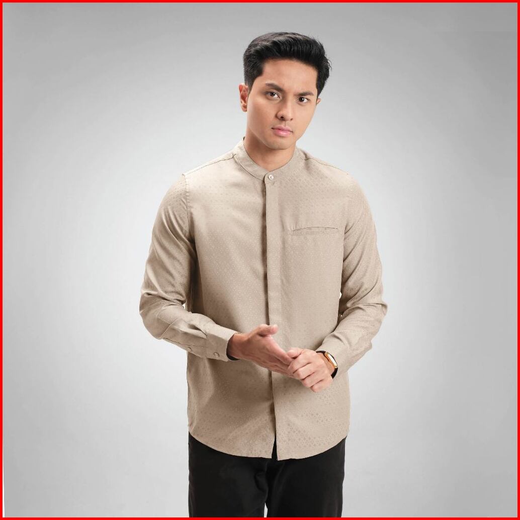 Cutoff Hussein Dobby Bordir Collarless Shirt Kemeja Koko Pria Motif Lengan Panjang