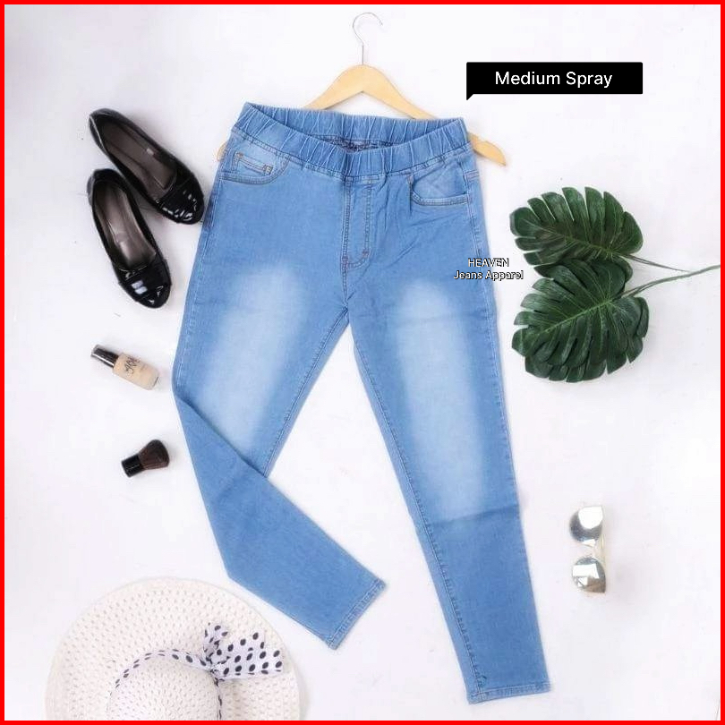 Celana Legging Jeans Wanita Panjang Jumbo Pinggang Karet Melar