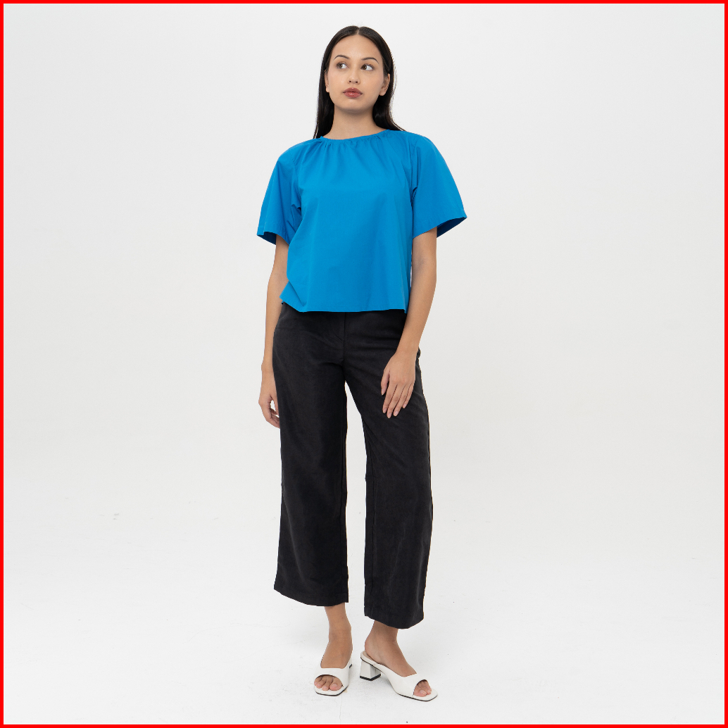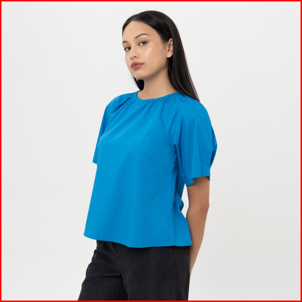 M231 Kemeja Wanita Blouse Katun Gather Cap Sleeve Pendek Biru 2914c