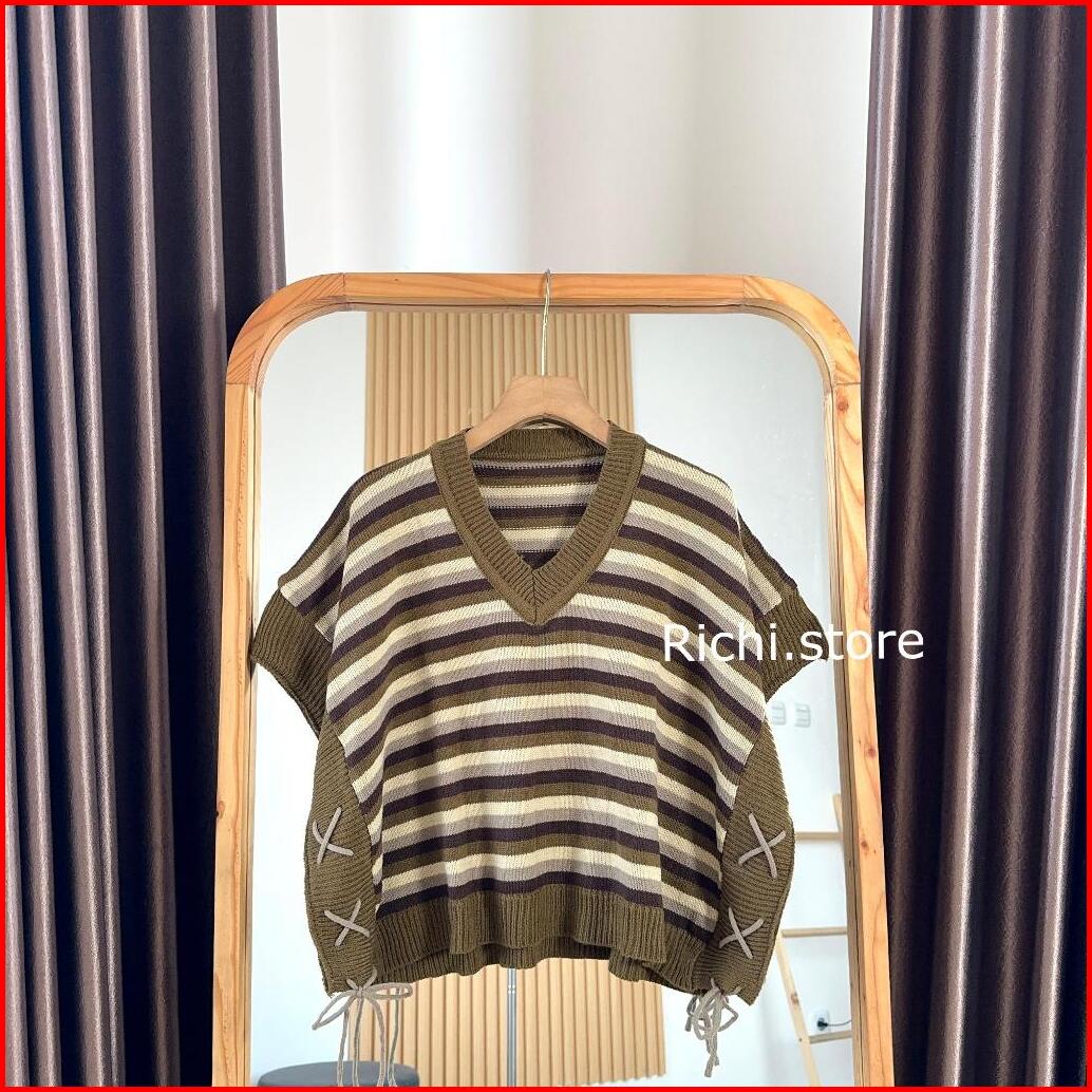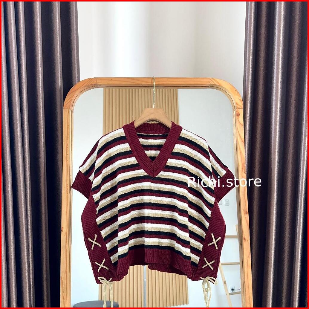Ariana Vest Crop Rajut Salur Baju Wanita Pendek Knitwear Rompi Tali Serut