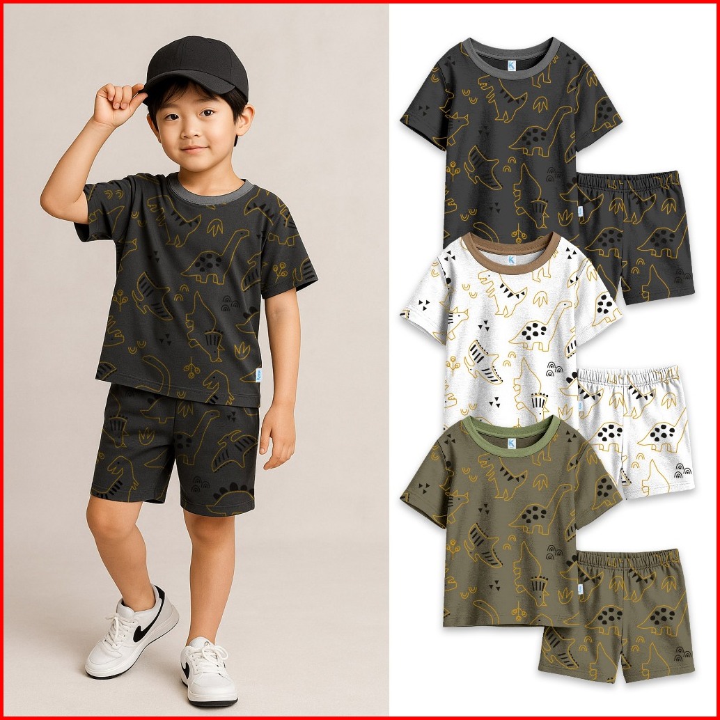 Kennai Baju Setelan Anak Pendek Laki Laki Oneset Anak Perempuan Series Dino Line Usia 1-12 Tahun