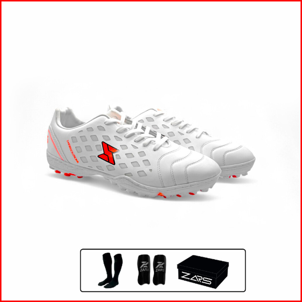 Zars - Evo Resolution Sepatu Futsal Mini Soccer Rumput Sintetis Turf White Oren Free Kaos Kaki Deker Sudah Jahit Sole