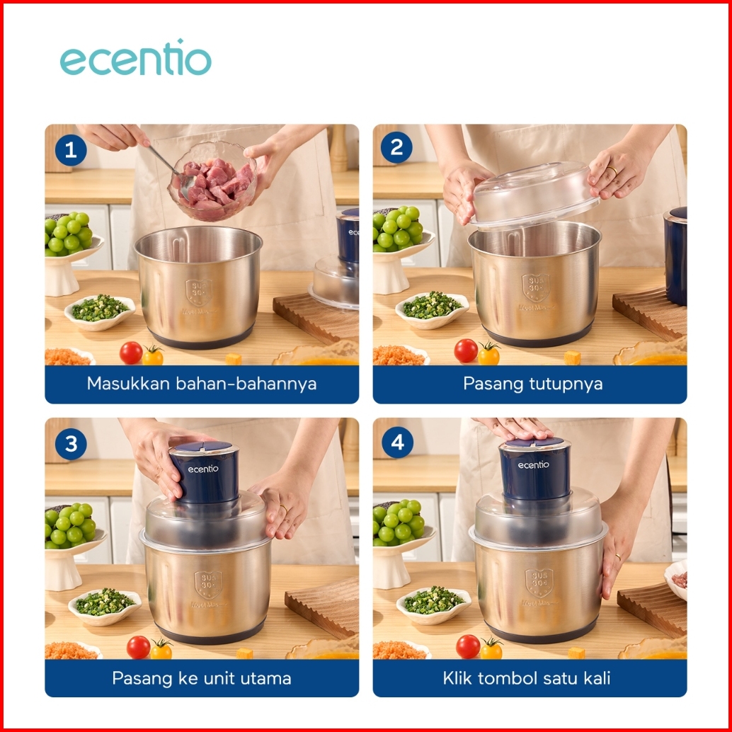 Ecentio Food Chopper 3l 4 Pisau Stainless Steel 304 Penggiling Daging Sayur Meat Grinder Kova Kraser Sertifikasi K3l
