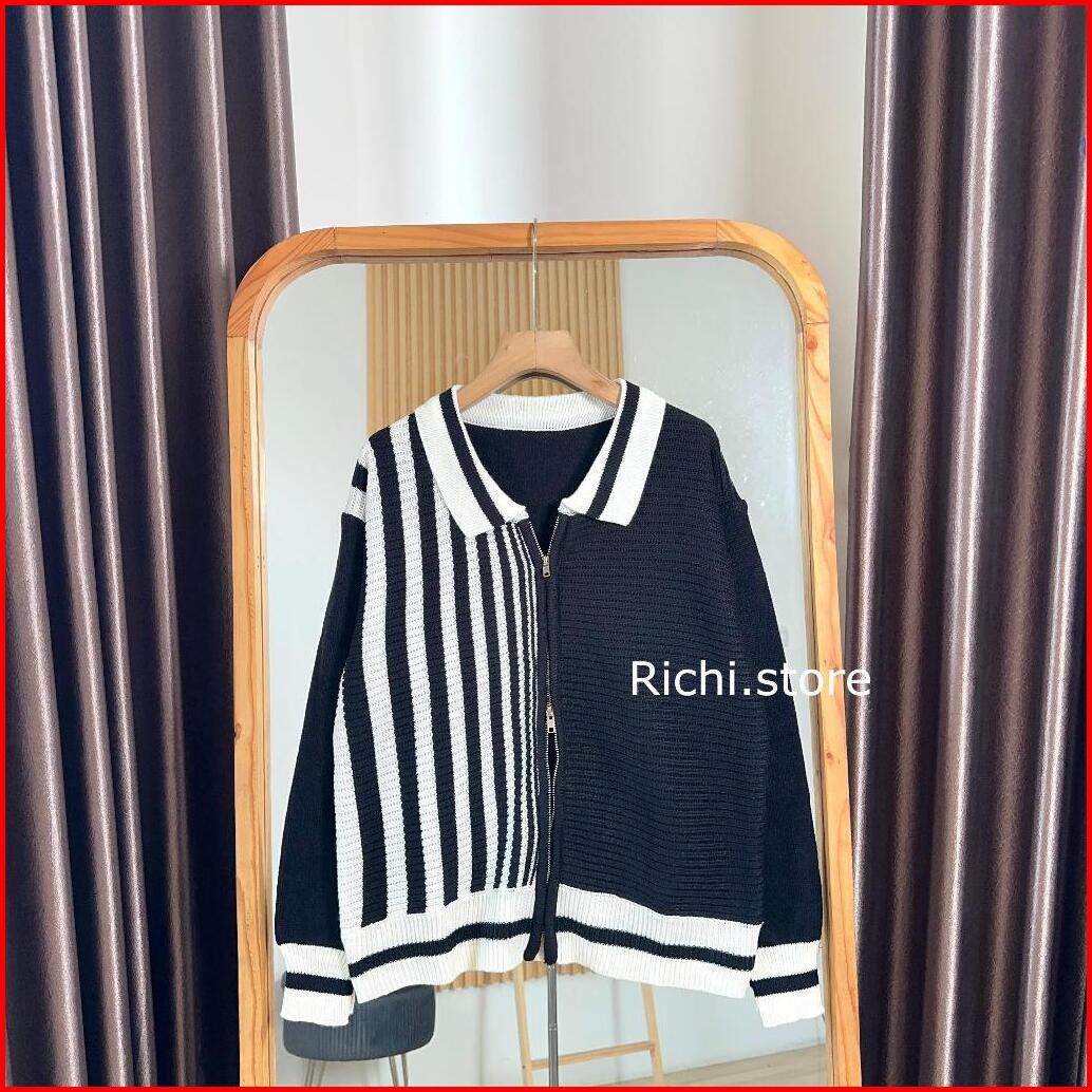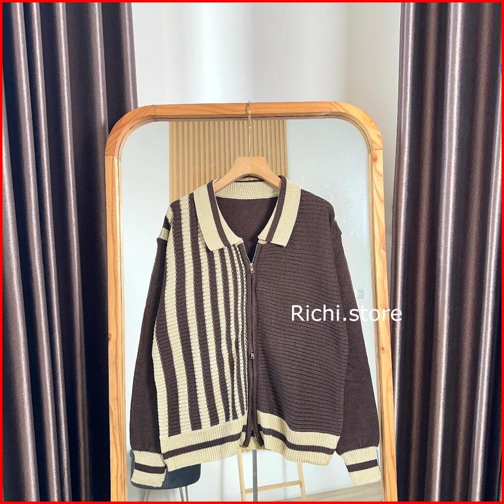 Sabrina Cardigan Zipper Rajut Berkerah Knitwear Garis Atasan Wanita