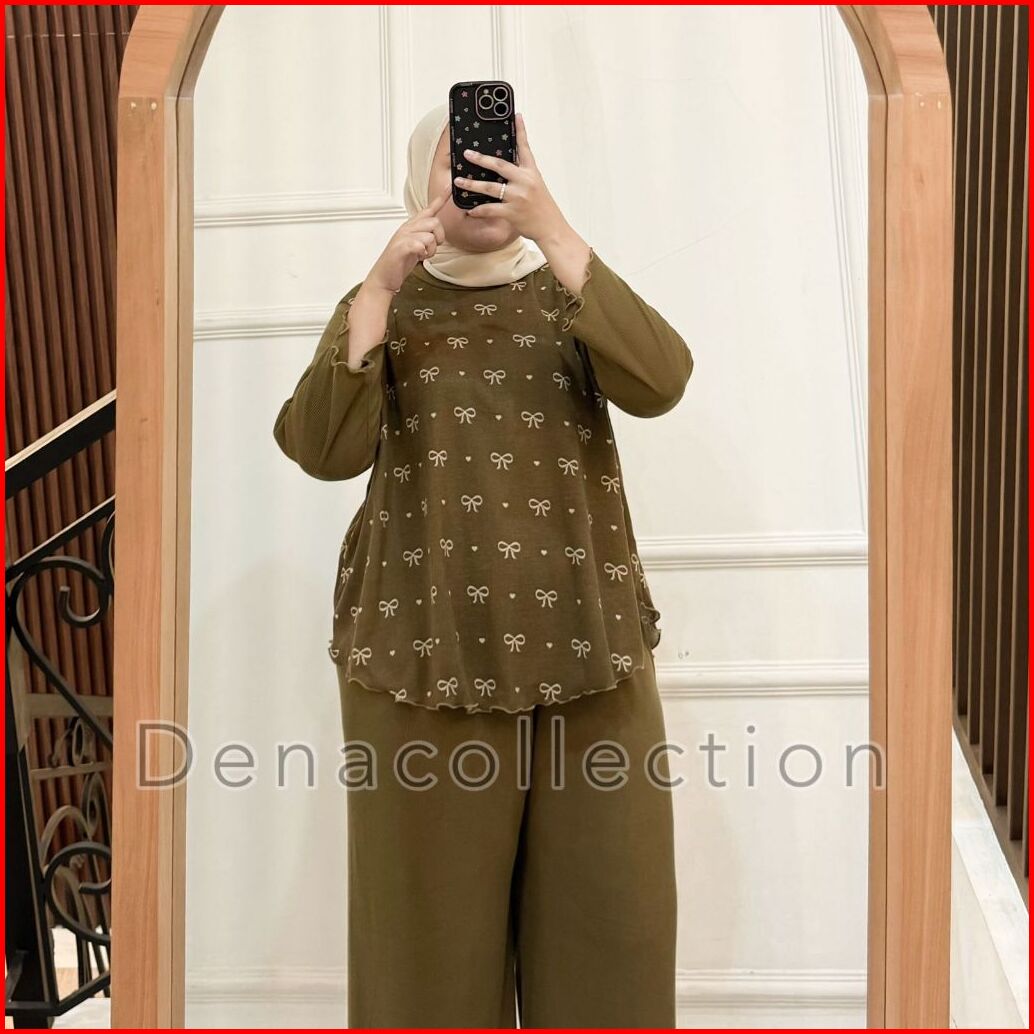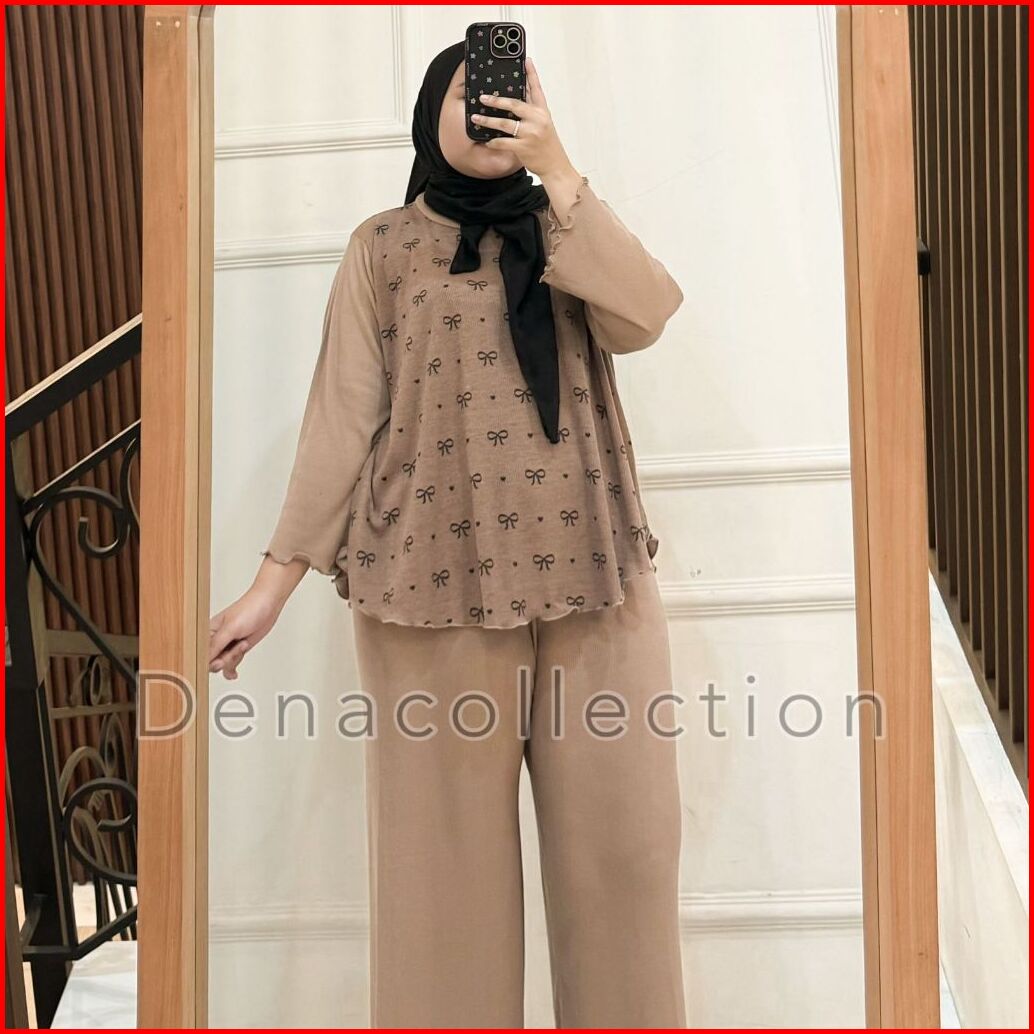Denacollection Arunika Setelan Celana Kulot Polos Panjan Atasan Kombinasi Pita Rib Knit