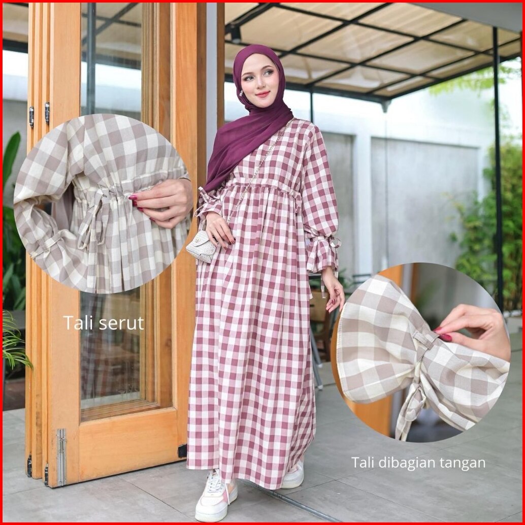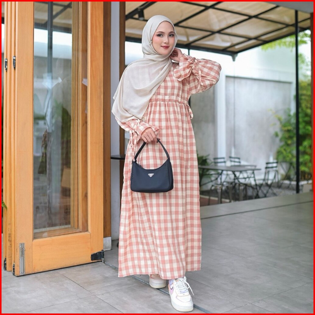 Proudyhijab - Lana Square Dress Motif Kotak Kotak Variasi Tali Serut Samping Dress Wanita Busui Friendly Resleting Depan