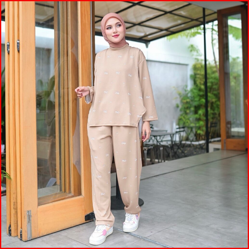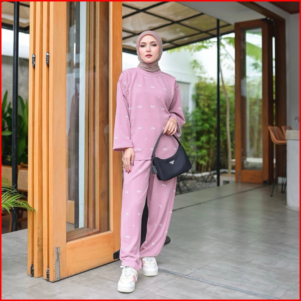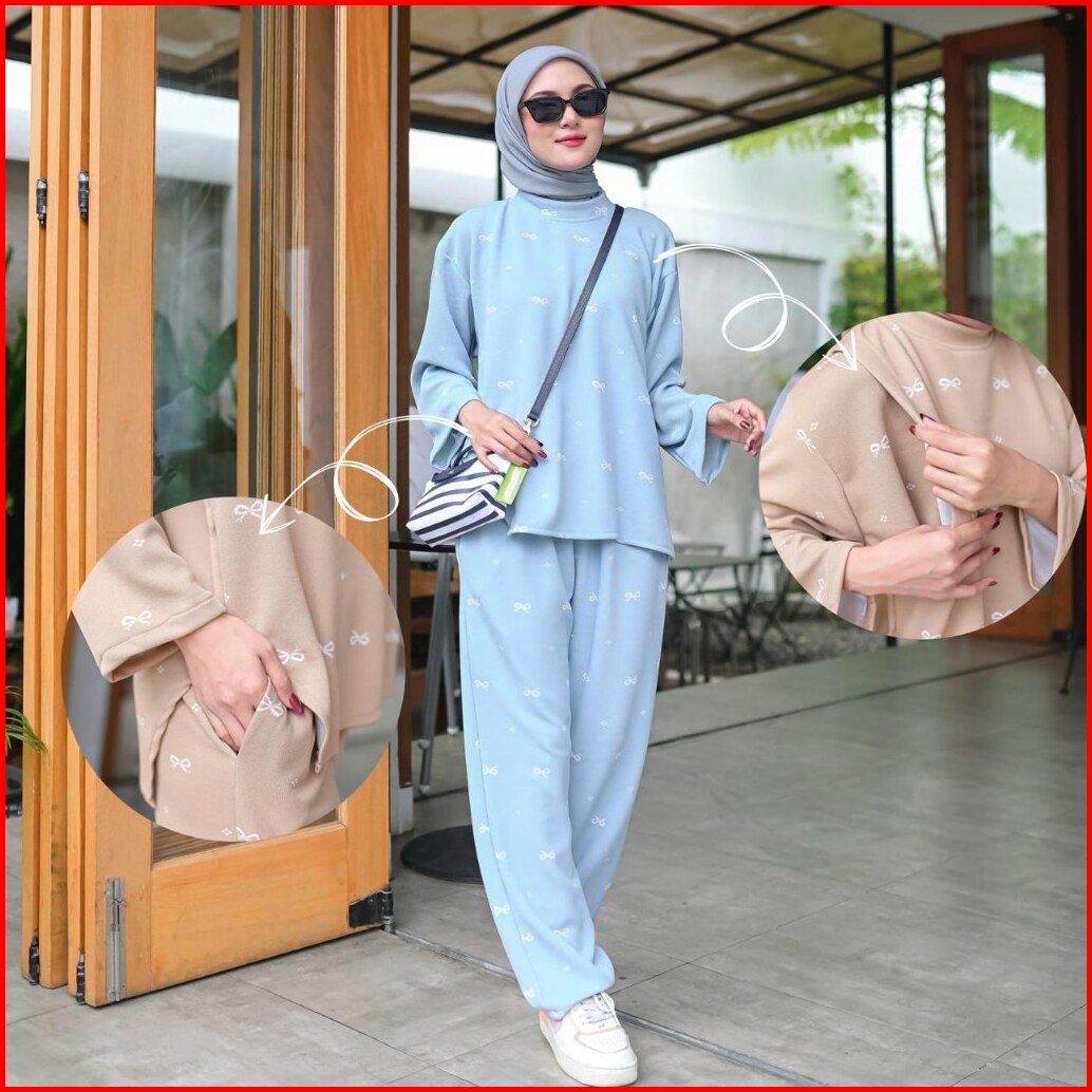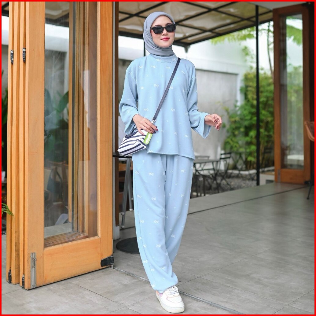 Proudyhijab - Orla Sleepwear Setcel Setelan Celana Motif Pita Setelan Wanita Kekinian Busui Friendly Bukaan Kanan Kiri