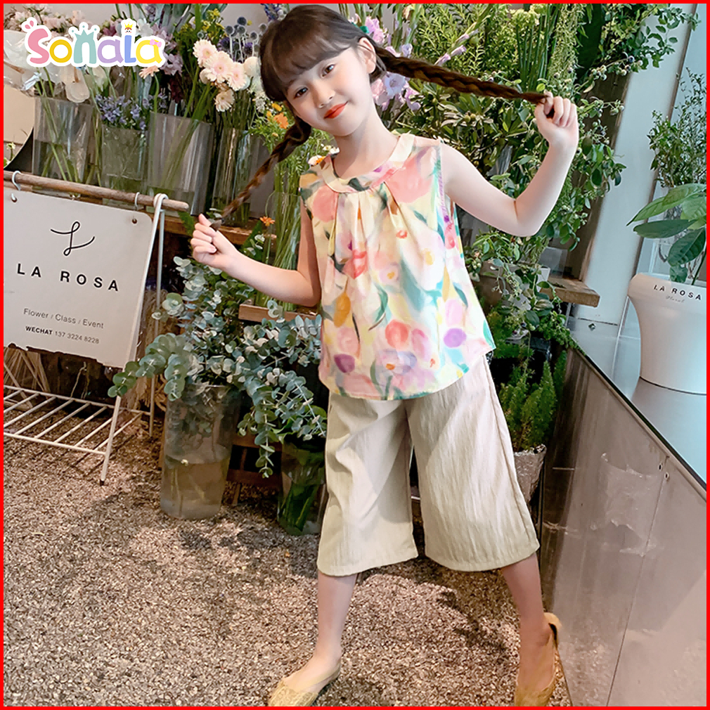 Setelan Baju Anak Perempuan 2-7 Tahun Setelan Atasan Bunga Tanpa Lengan Celana Wide Leg Santai