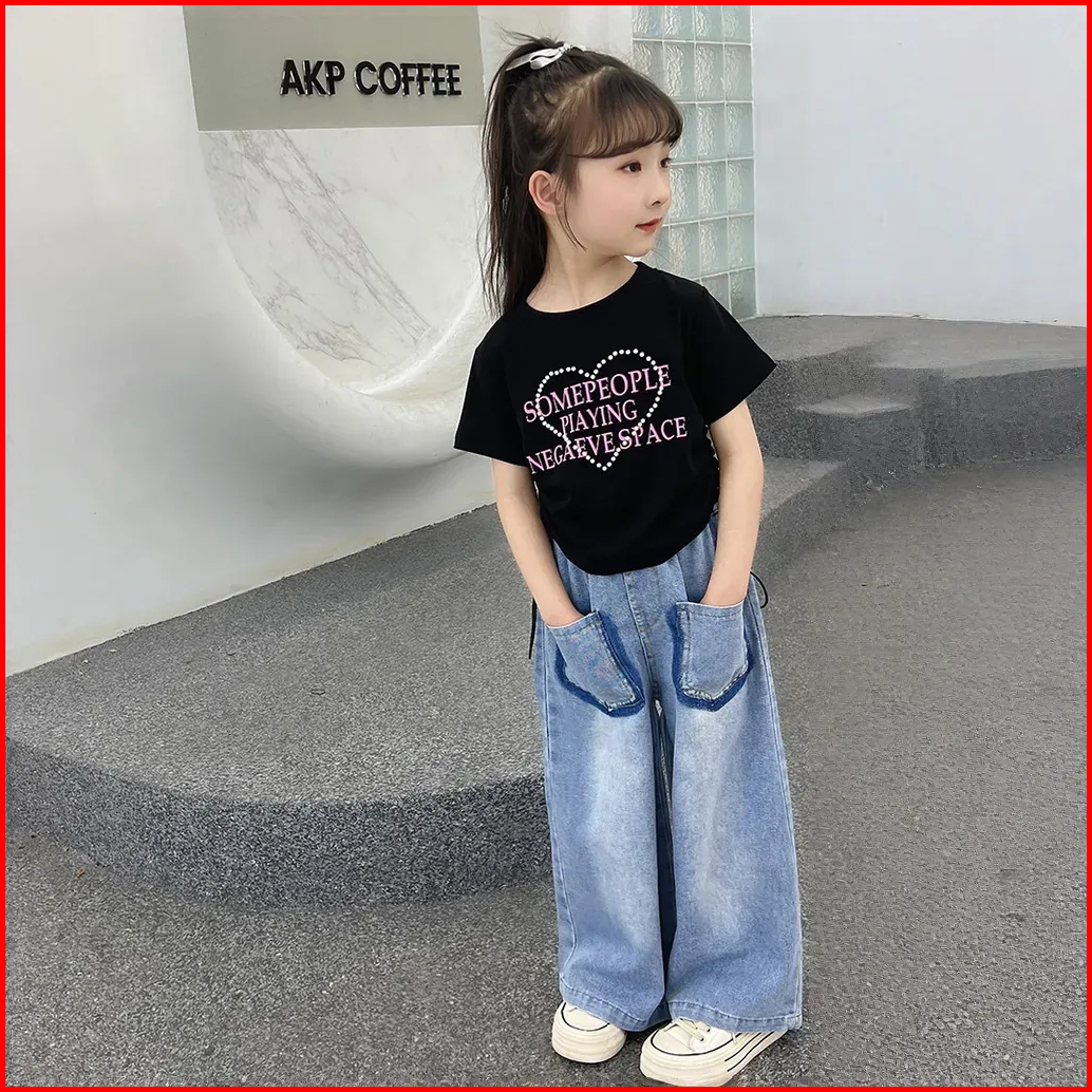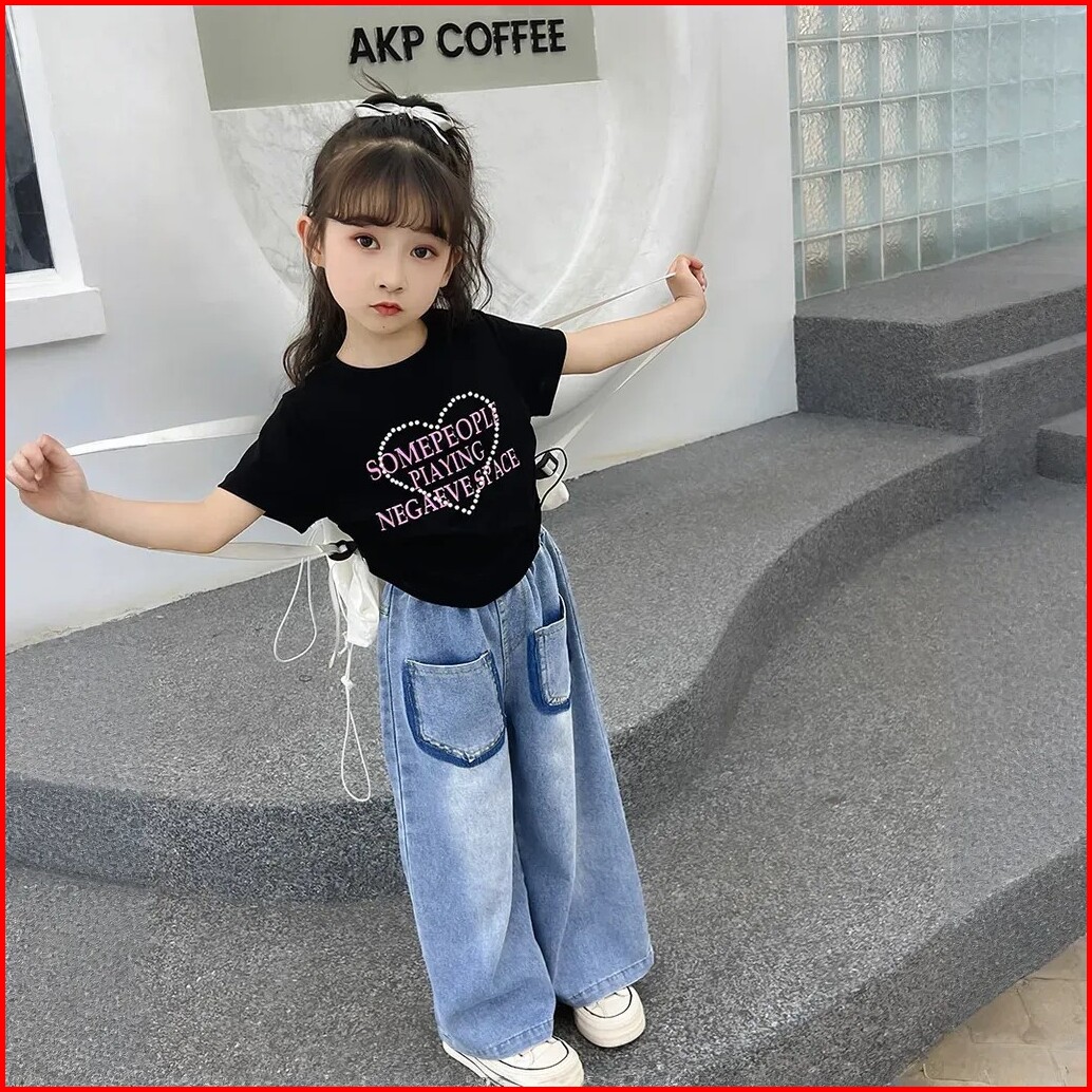 Setelan Kaos Anak Perempuan 4-9 Tahun Korean Style One Set Atasan Lengan Pendek Dan Jeans Panjang