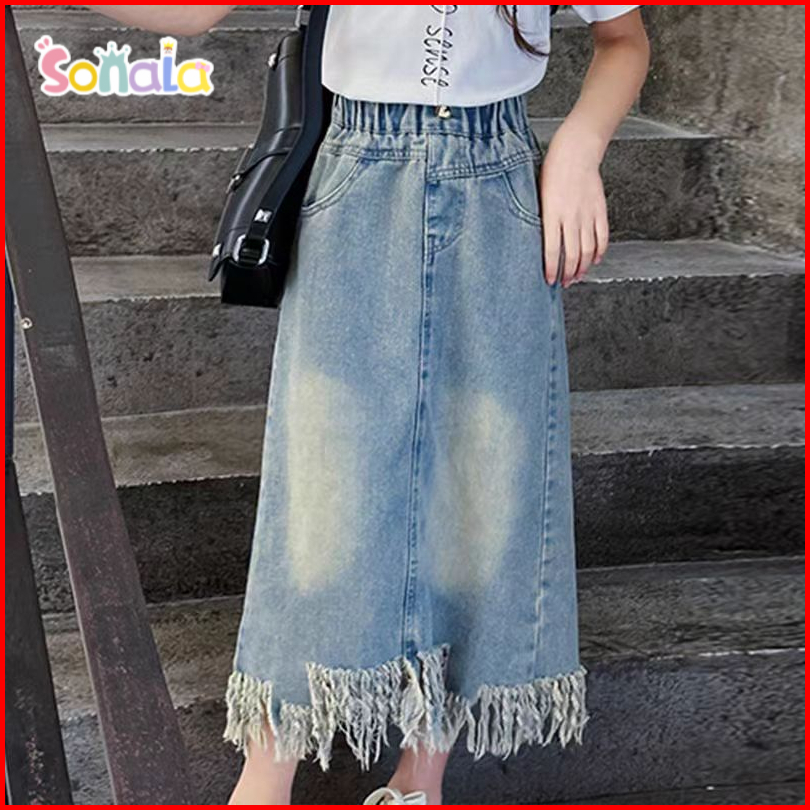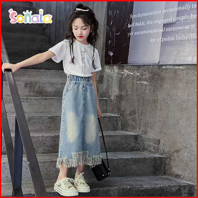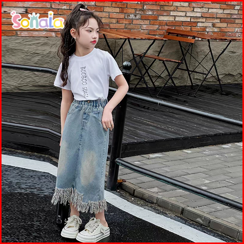 Sonala Setelan Rok Jeans Anak Perempuan Musim Panas Kaos Katun Rok Jeans Belah Rumbai 3-10 Tahun