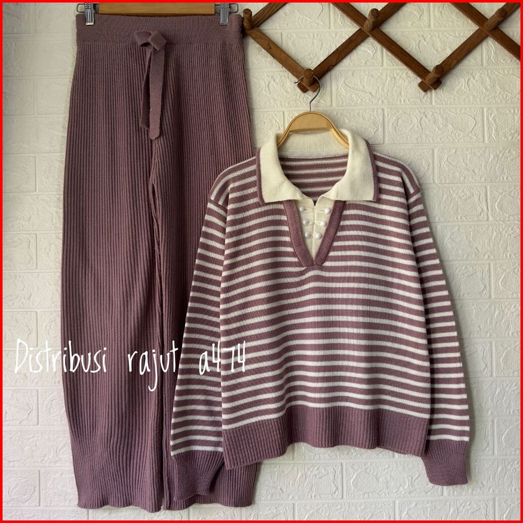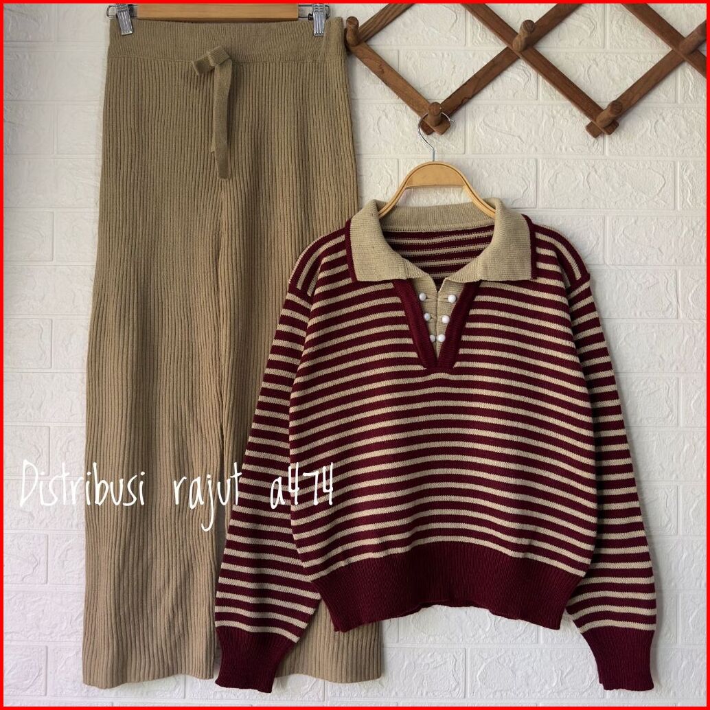 Oneset Sweater Rajut Ozawa Kerah Polo Setelan Celana Kulot Rajut Wanita