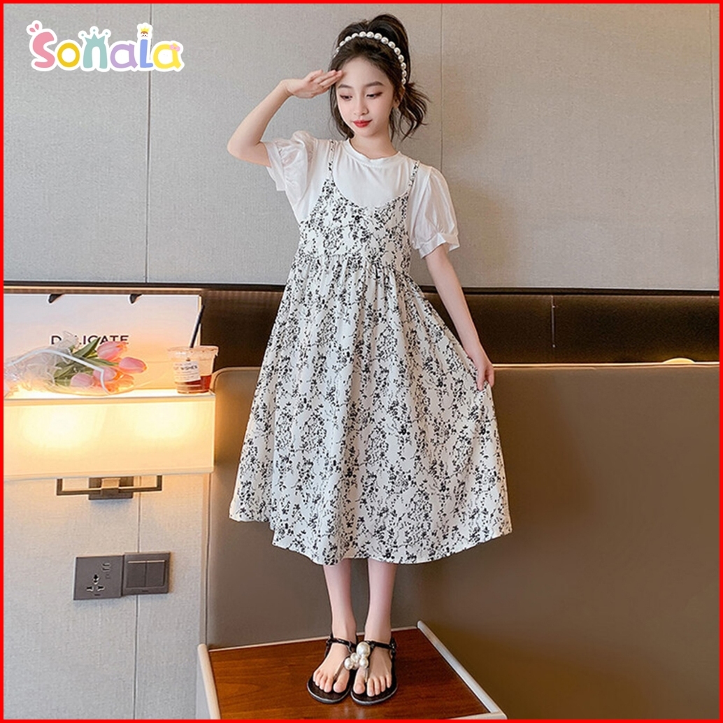 Gaun Anak Perempuan Motif Bunga Kecil Dengan Desain Dua Lapis Palsu Dan Dilengkapi Kalung Hiasan
