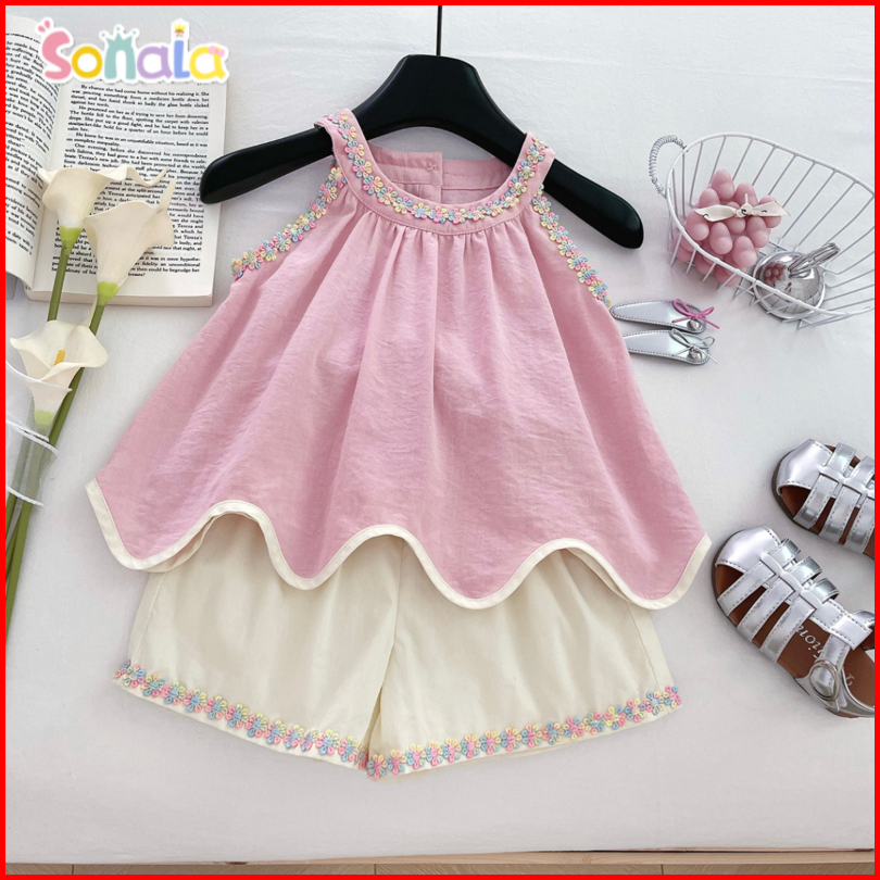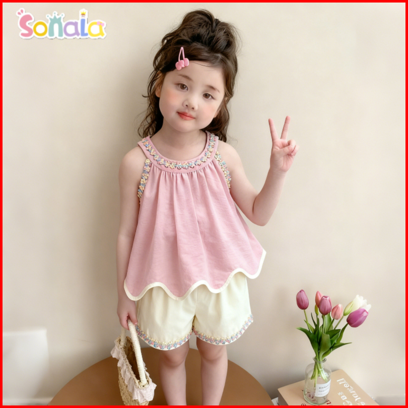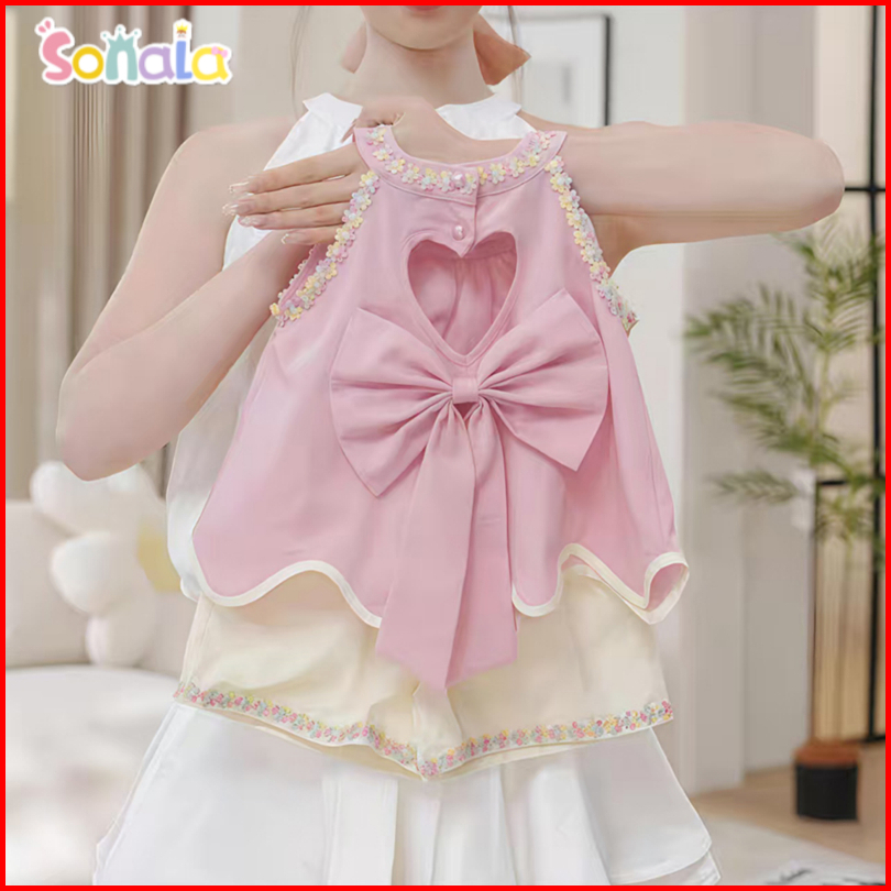 Sonala Setelan Tanpa Lengan Anak Perempuan Atasan Pita Tanpa Punggung Berbentuk Hati Celana Pendek Kasual