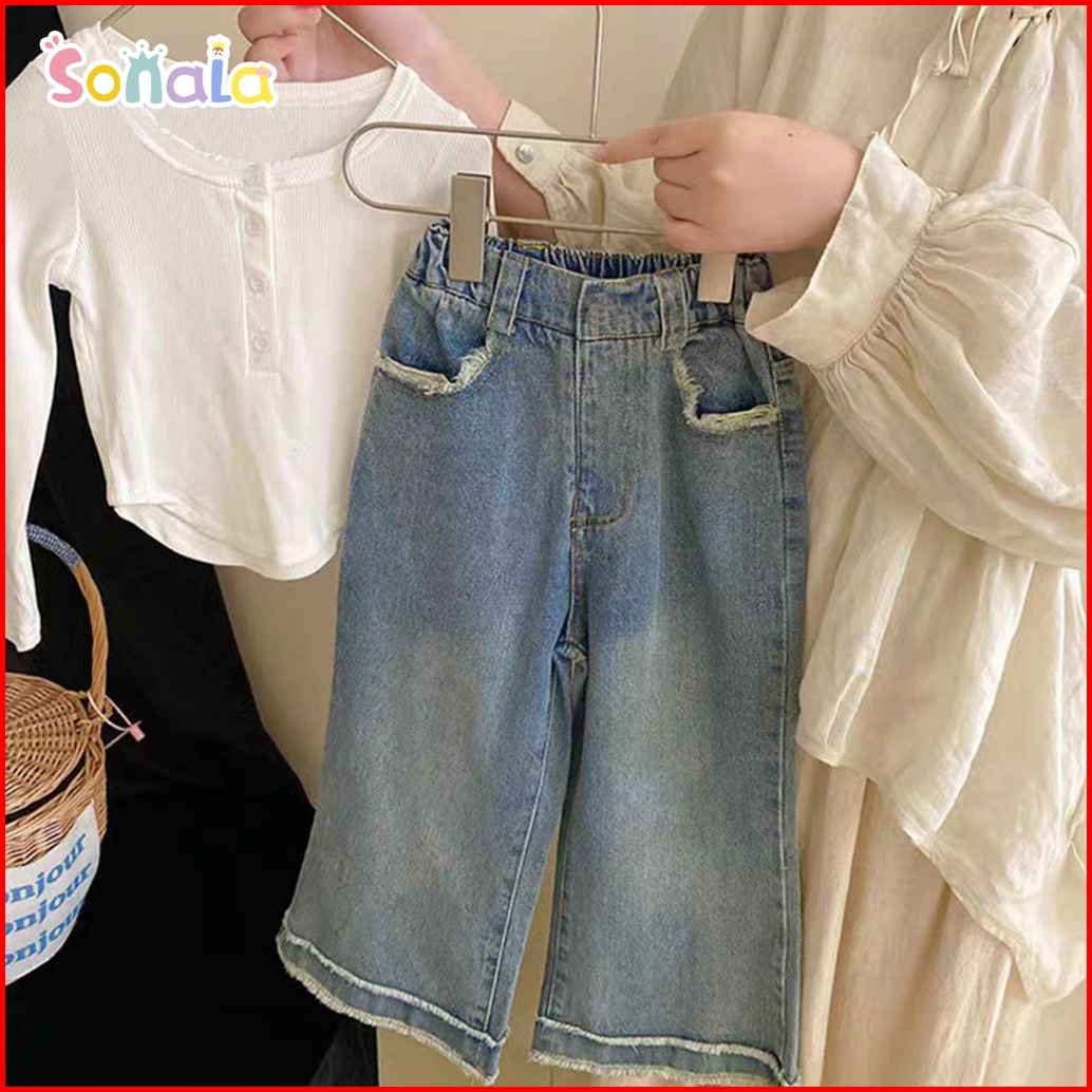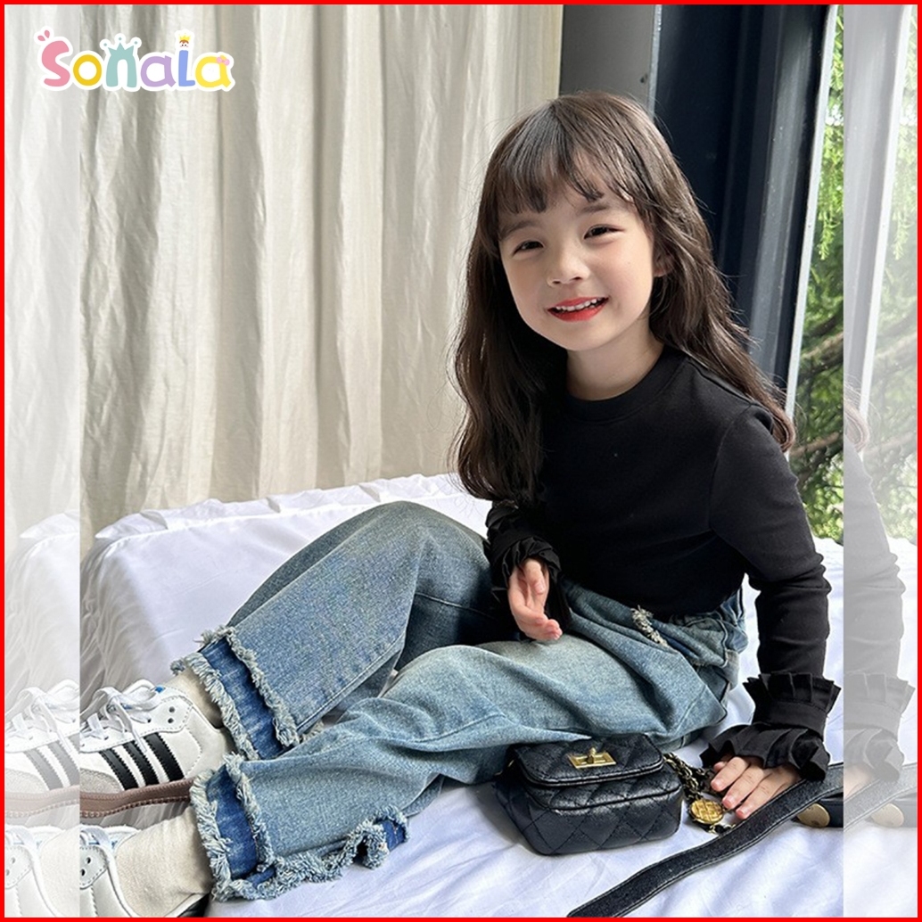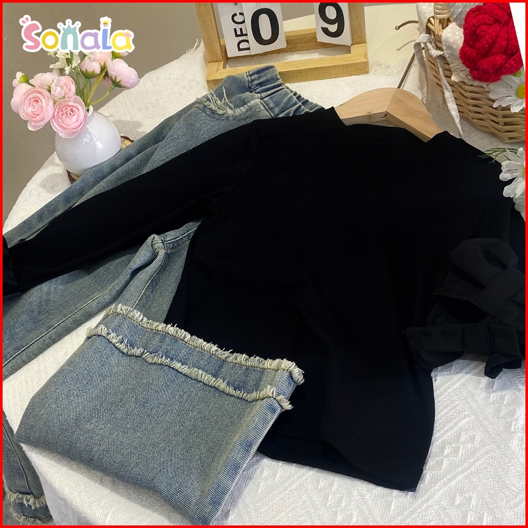 Setelan Anak Perempuan Usia 3-10 Tahun Celana Jeans Denim Lembut Kemeja Hitam Lengan Panjang