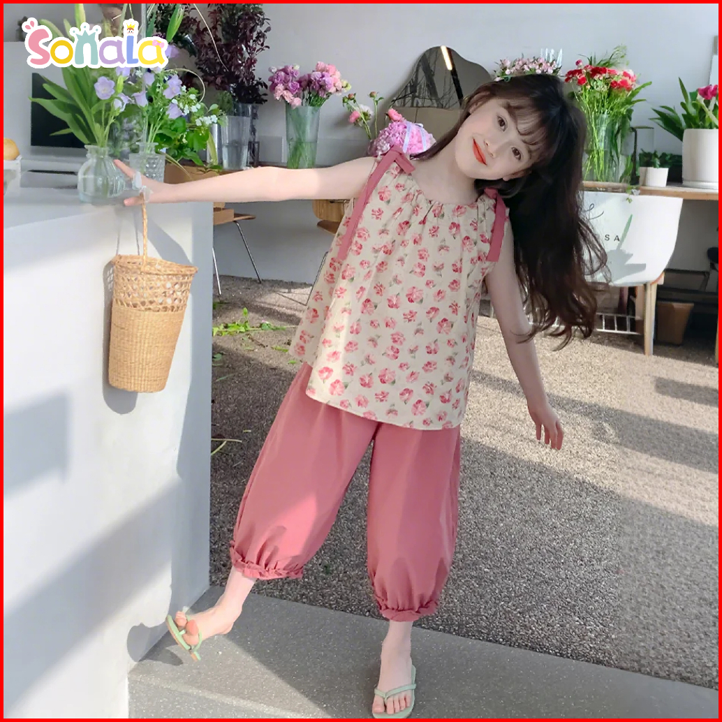 Setelan Baju Anak Perempuan Usia 4-9 Tahun Merah Muda Floral Kamisol Top Anak Celana Panjang