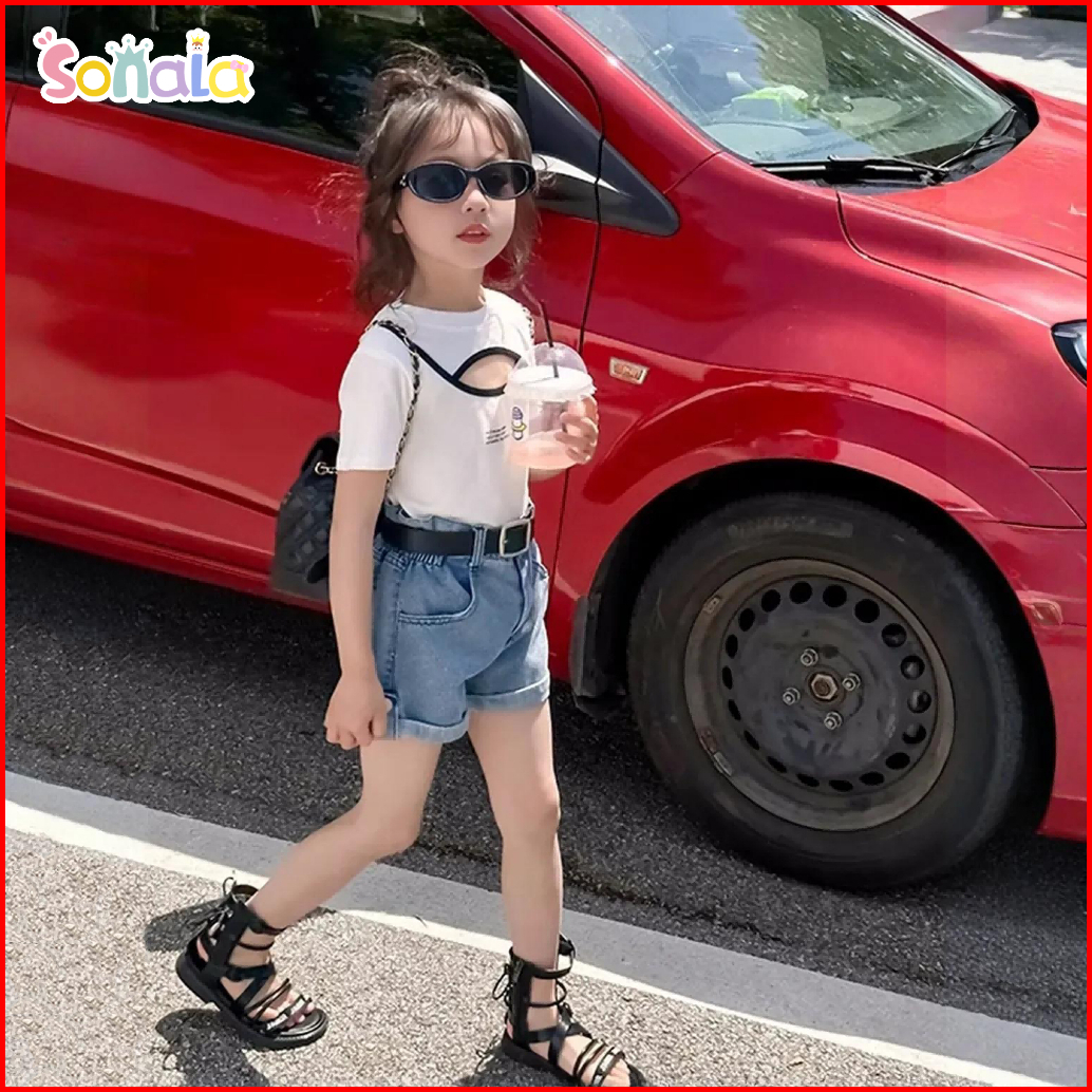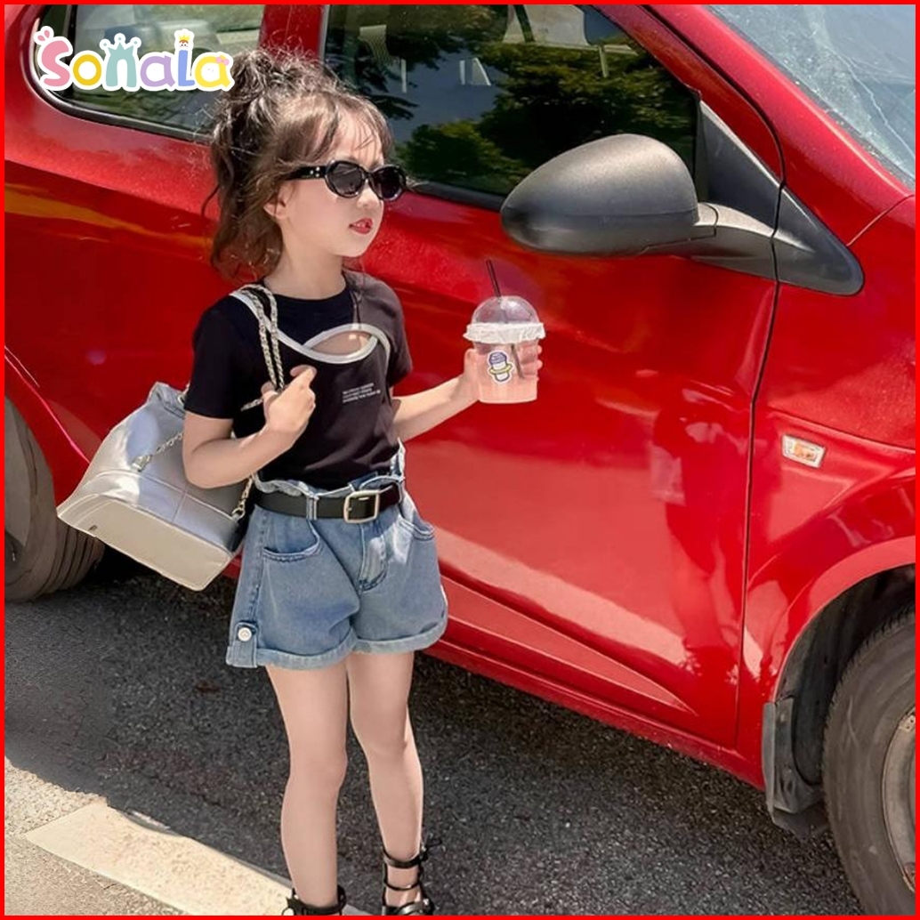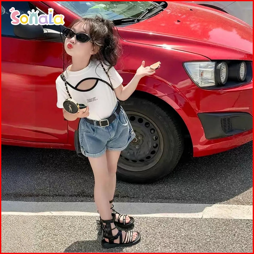 Setelan Anak Perempuan Kaos Desain Berlubang Celana Pendek Denim Pinggang Karet Hotpants