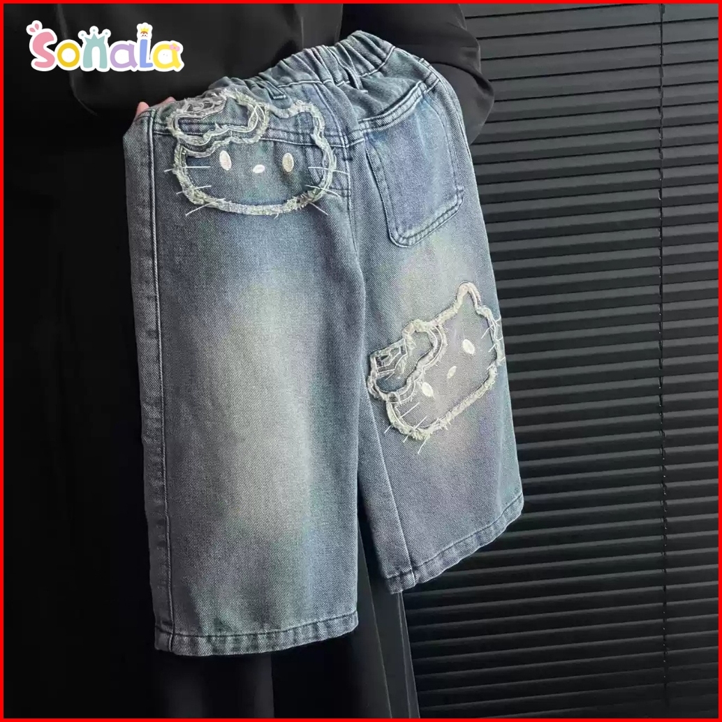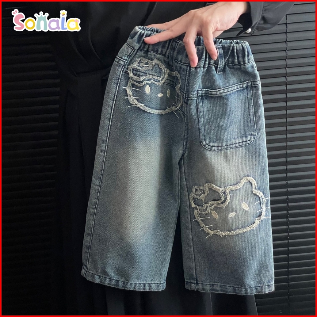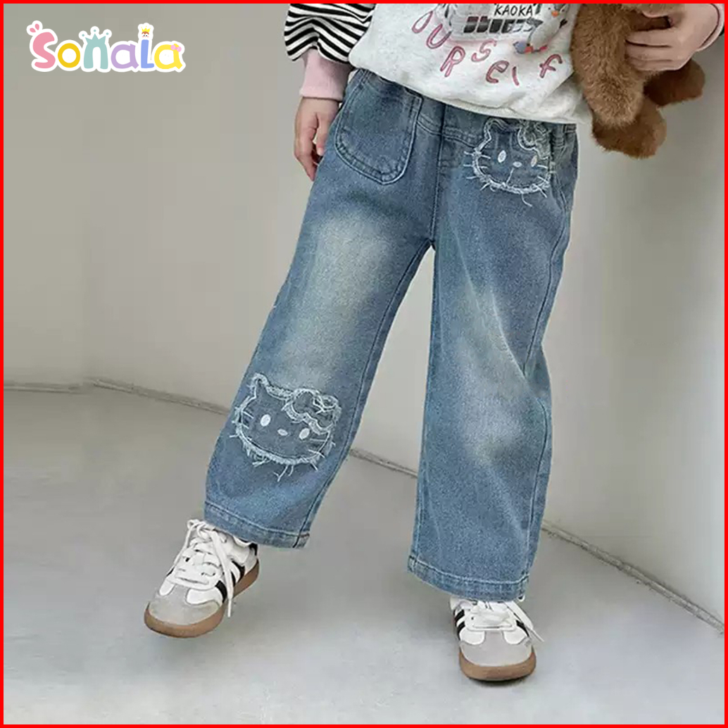 Korean Style Celana Jeans Anak Perempuan 2-10 Tahun Fashion Anak Celana Lurus Dengan Motif Kucing Bordir Jeans