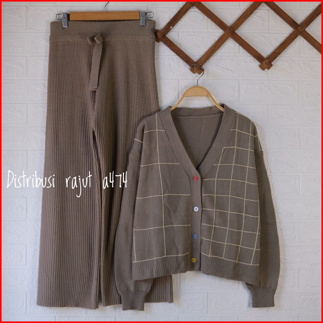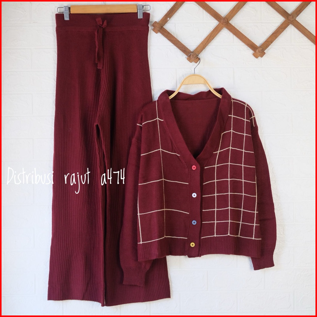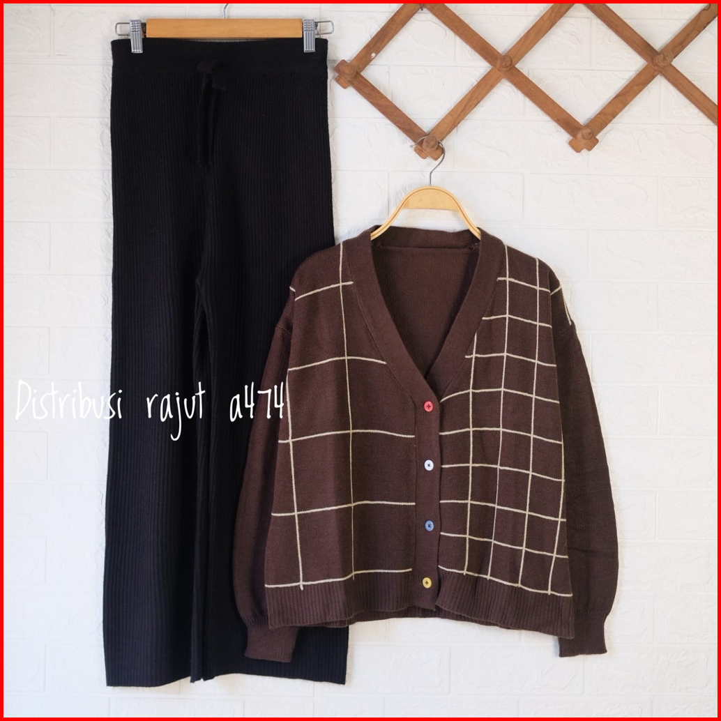 Oneset Salima Cardigan Rajut Motif Kotak Kotak Setelan Celana Kulot Rajut Wanita