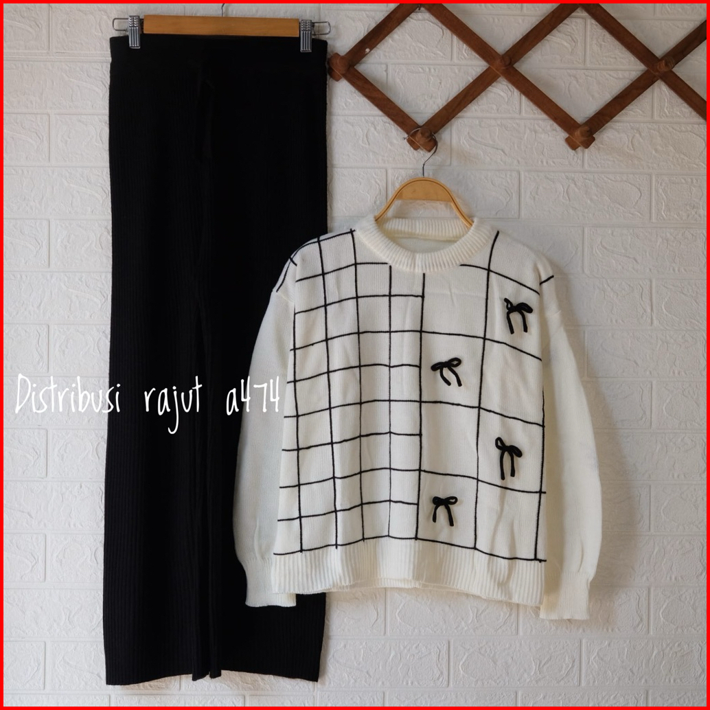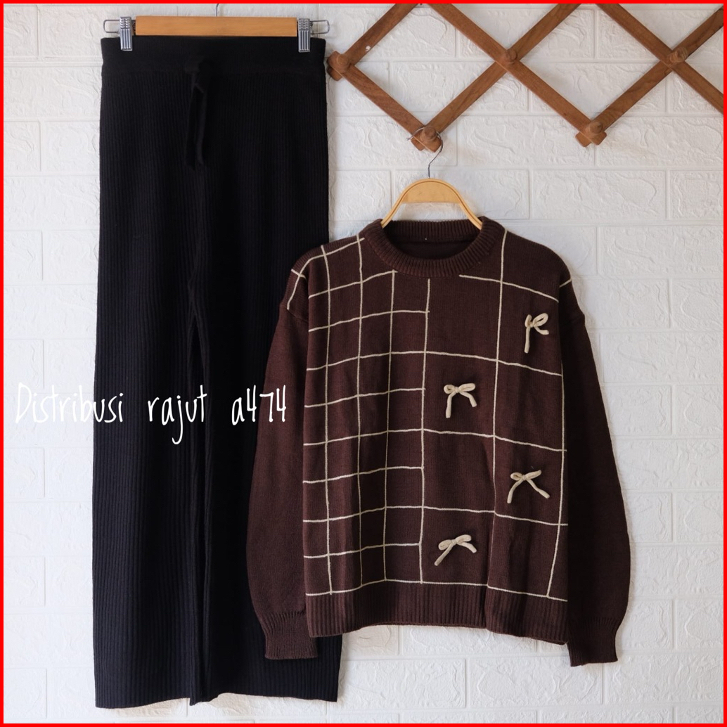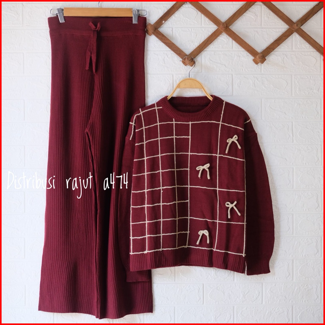 Oneset Khayrun Sweater Kotak Pita Setelan Celana Kulot Rajut Wanita