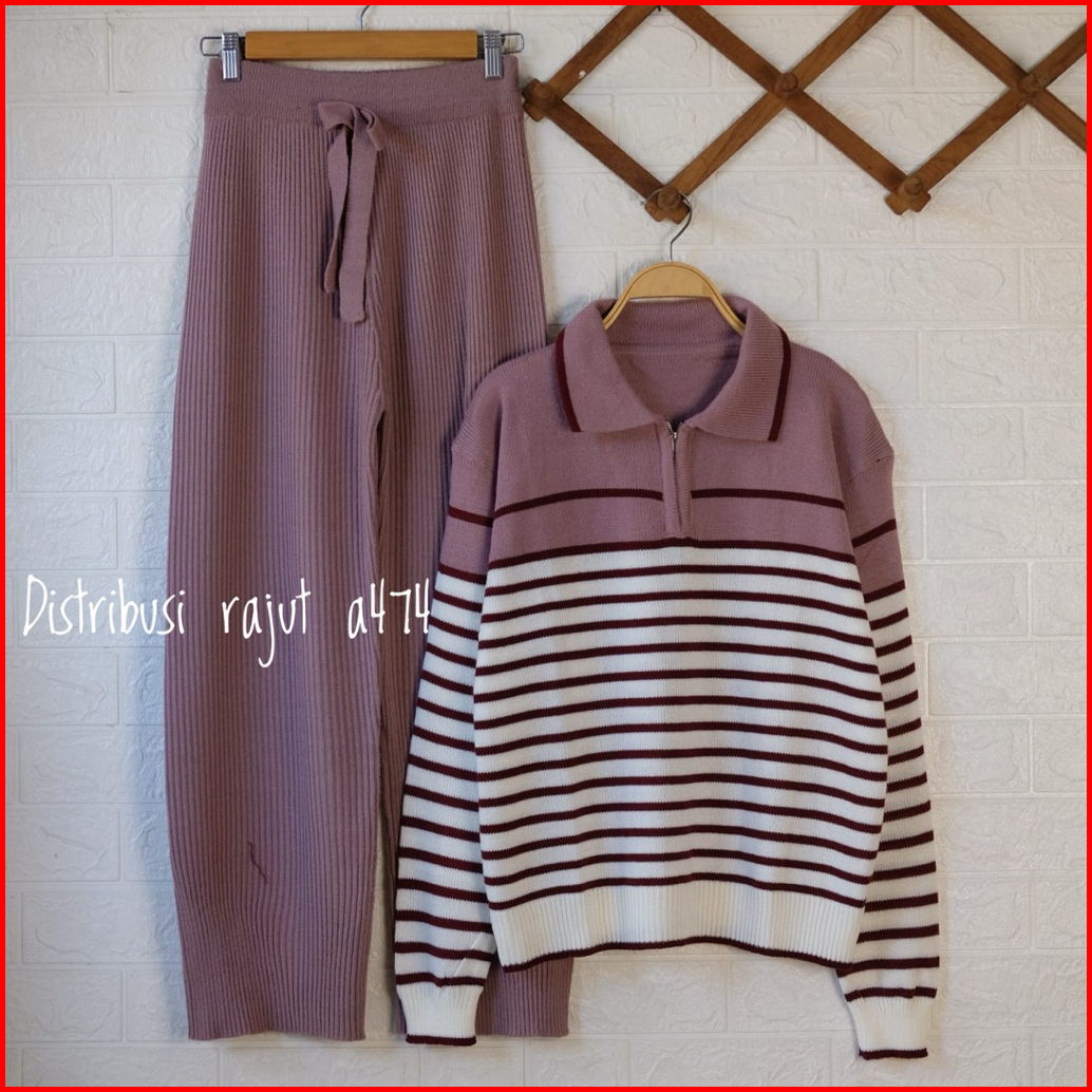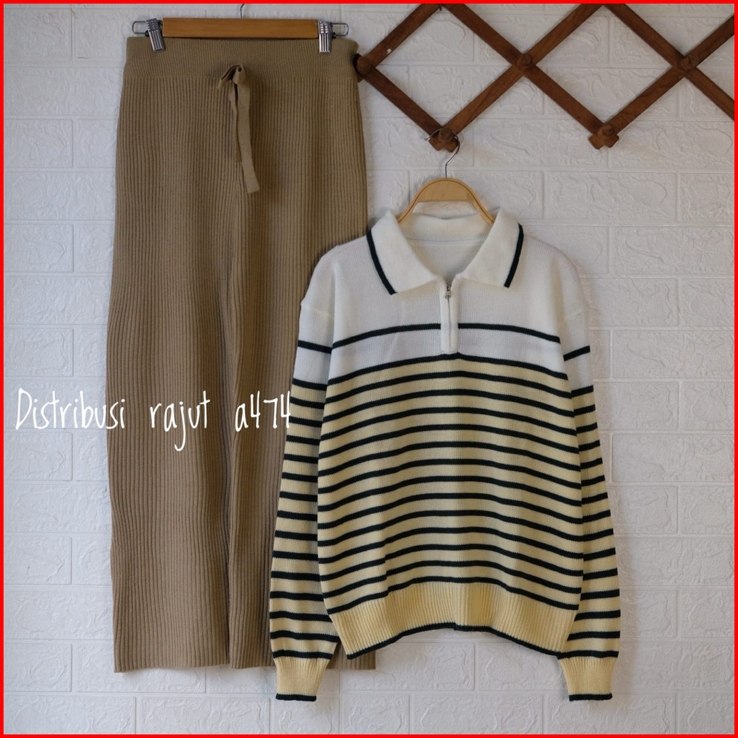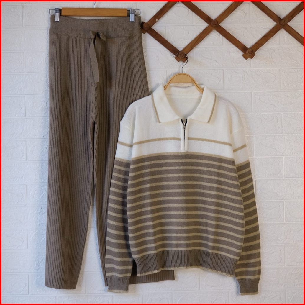 Oneset Sandriana Polo Sweater Rajut Setelan Celana Kulot Rajut Wanita