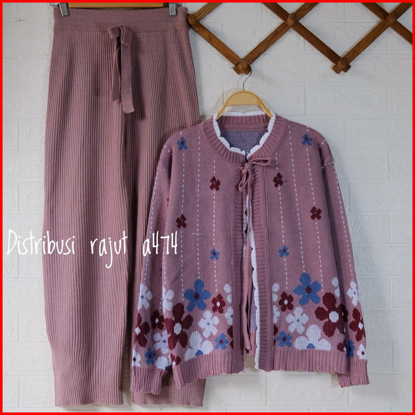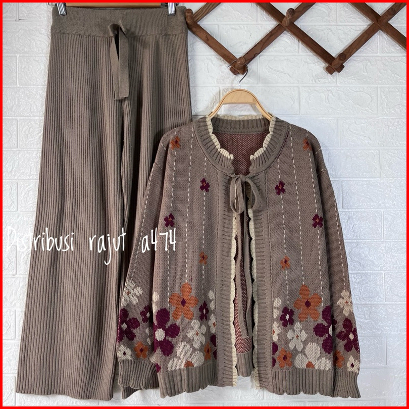 Oneset Cardigan Rajut Hasewa Motif Pita Bunga Setelan Celana Kulot Rajut Wanita