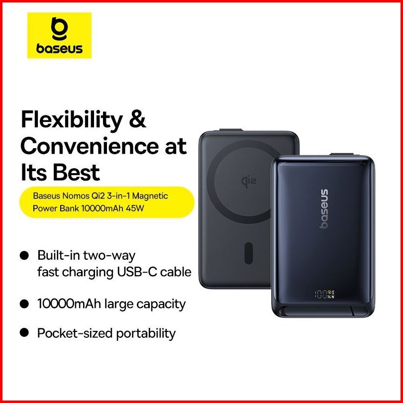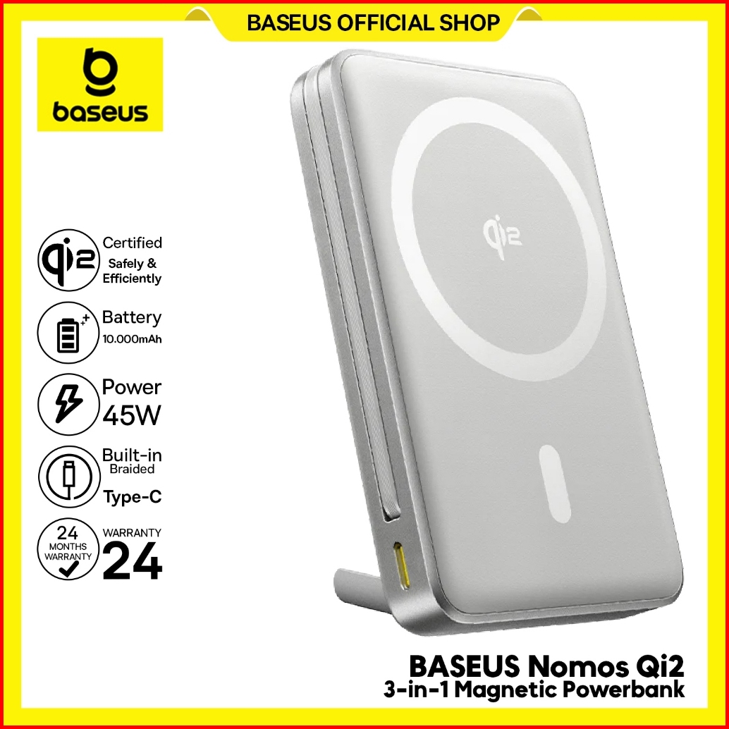 Baseus Powerbank Nomos Qi2 Kickstand Magnetic Power Bank With Built-in Usb-c Cable 10000mah 45w