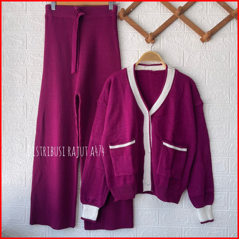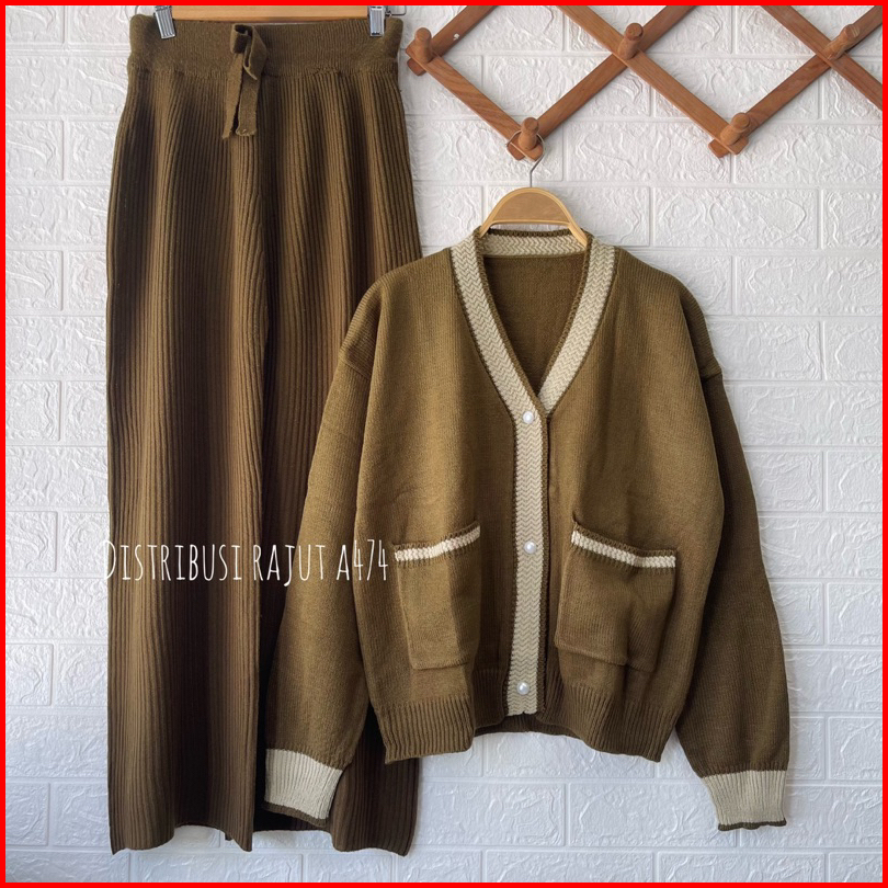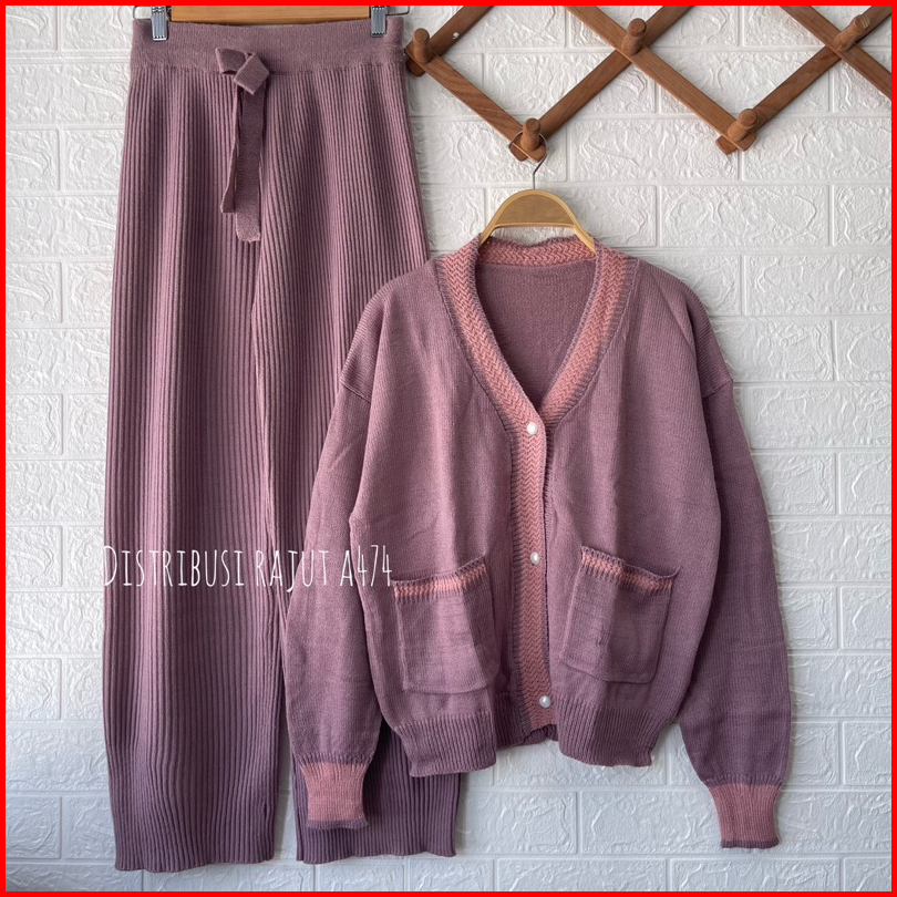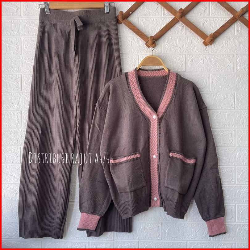 Oneset Cardi Combination Saku Setelan Celana Kulot Rajut Wanita