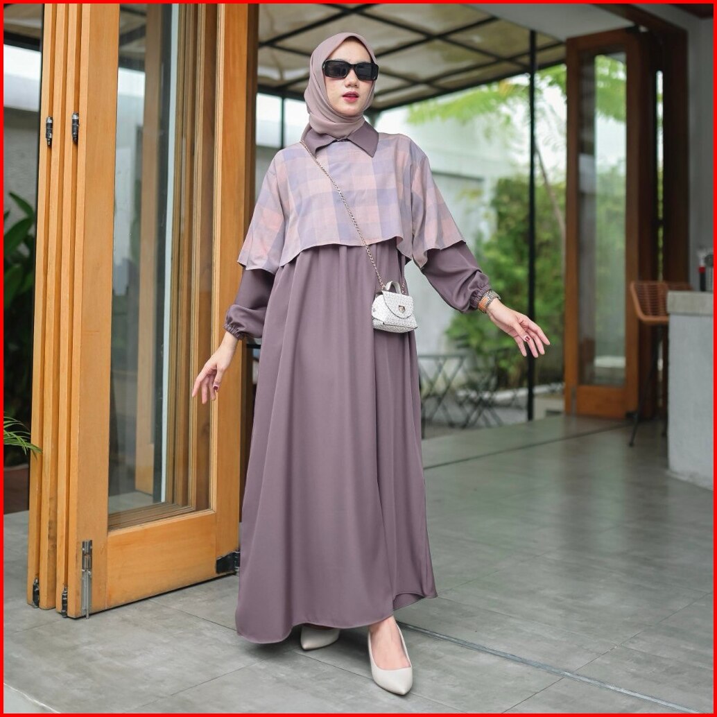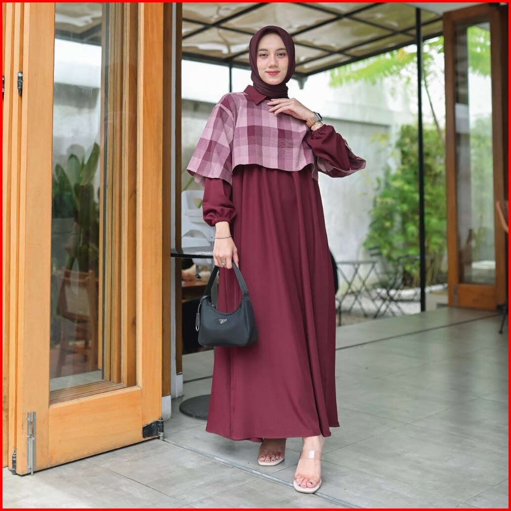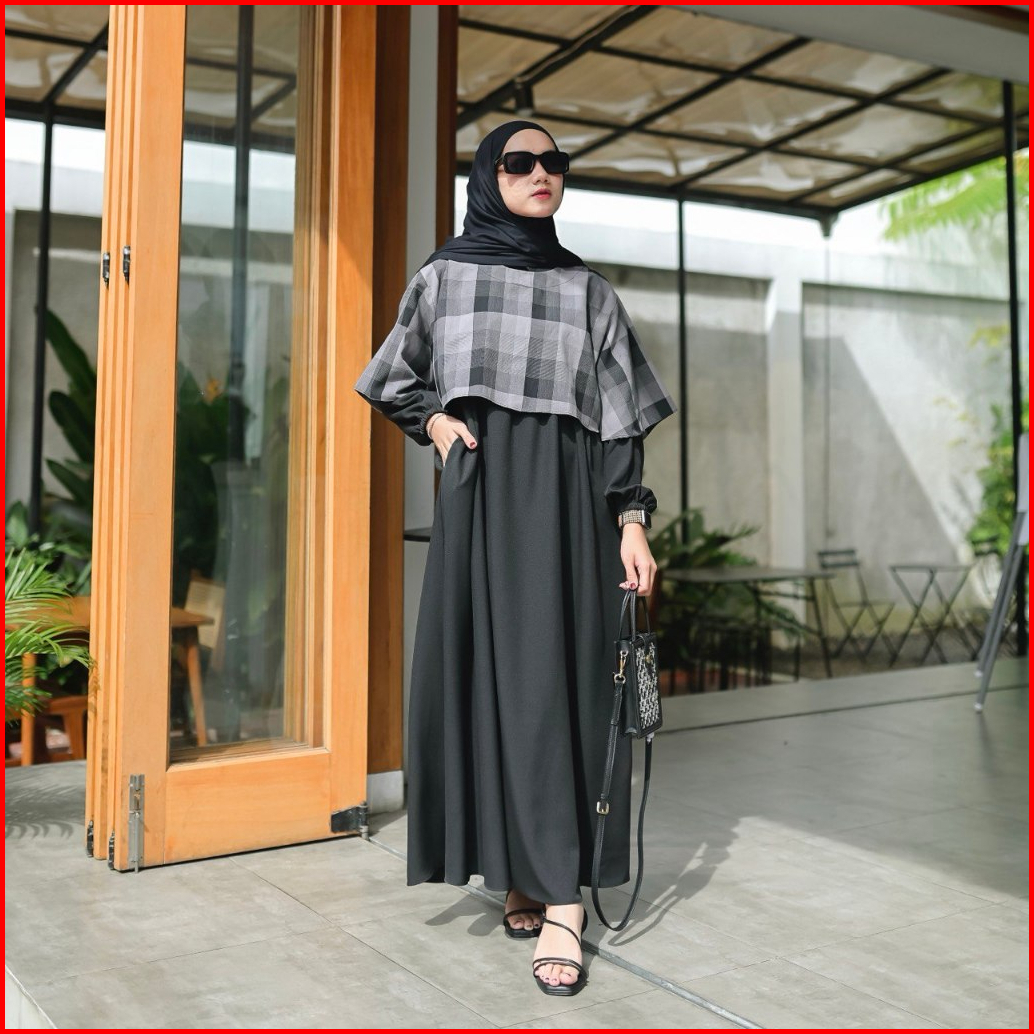 Proudyhijab - Yunabi Dress Outer Motif Kotak Kotak Dress Wanita Korean Style Lengan Balon Busui Friendly Bukaan Kanan Ki