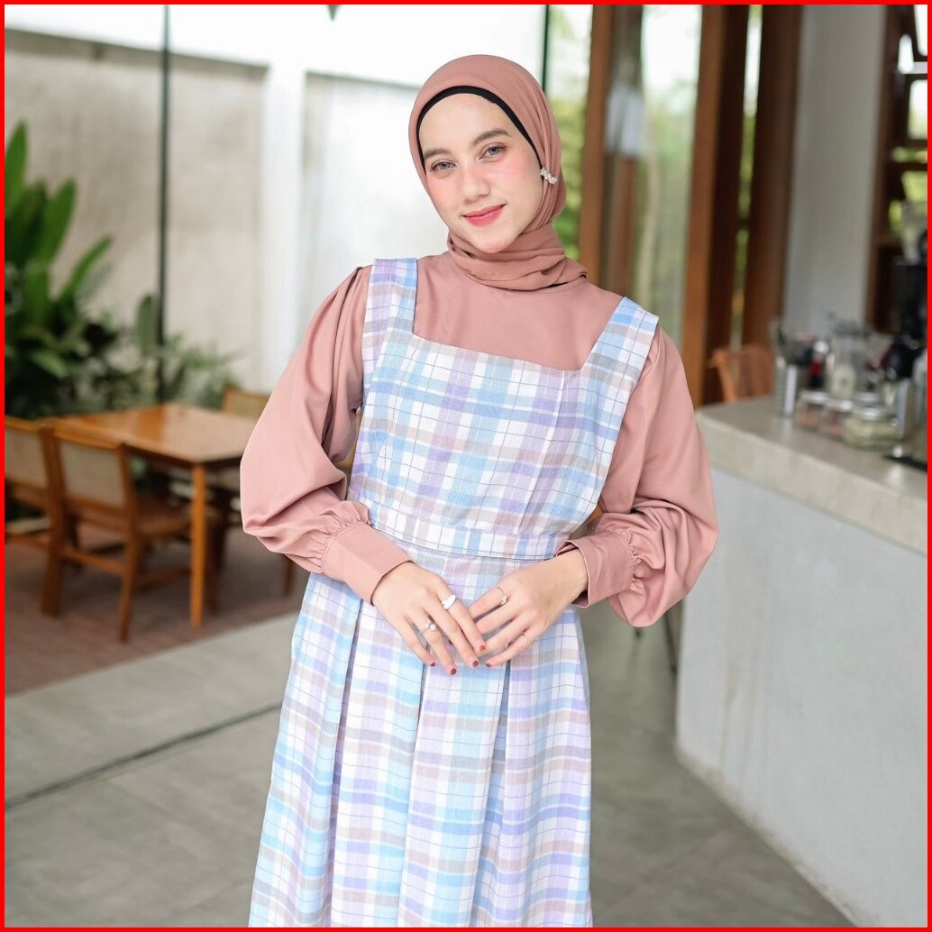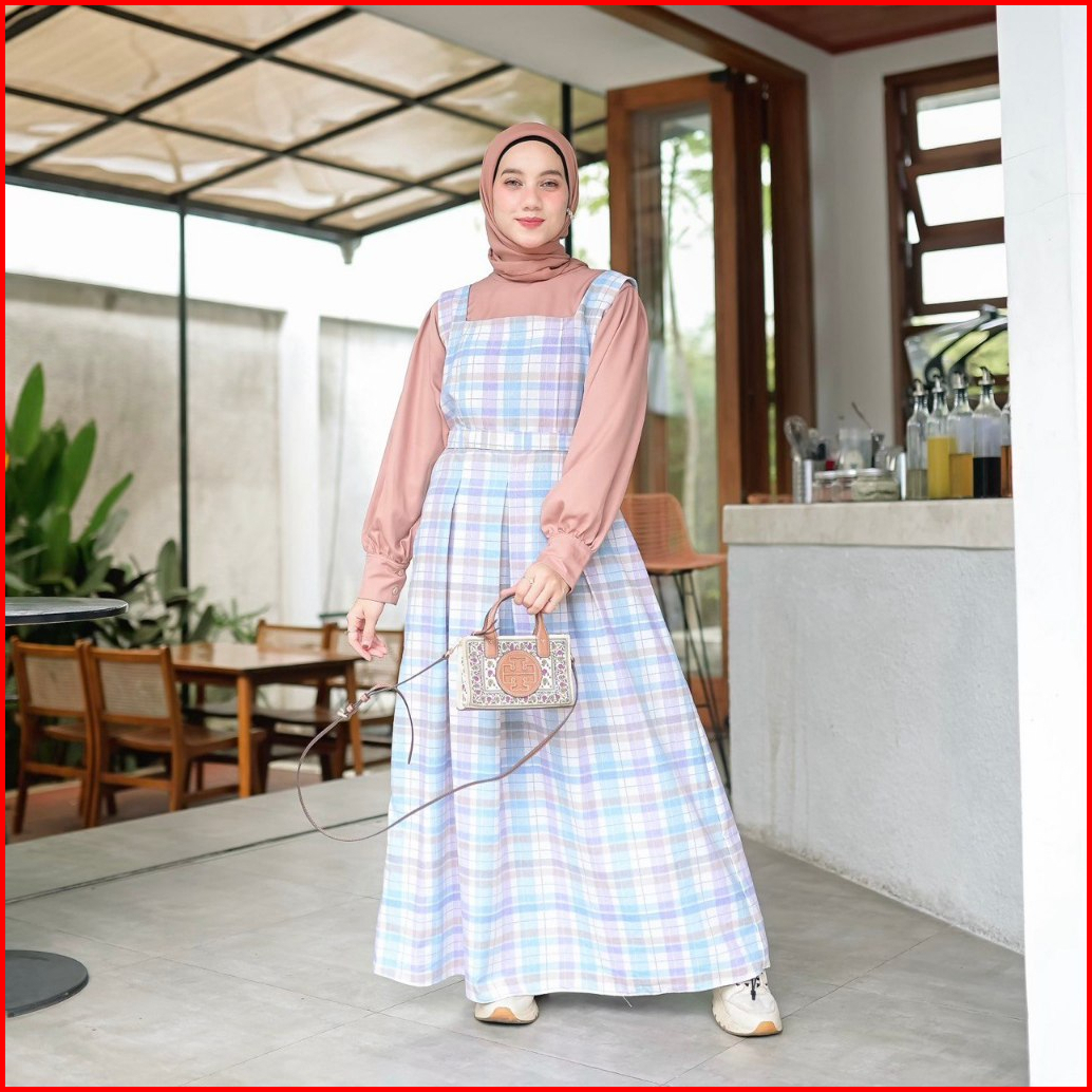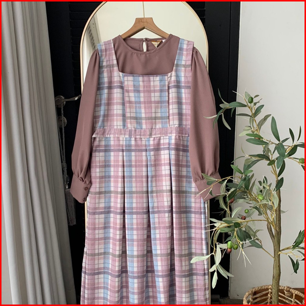 Proudyhijab - Faiha Dress Overall Motif Kotak Kotak Korean Style Dress Wanita Busui Friendly Bukaan Kanan Kiri