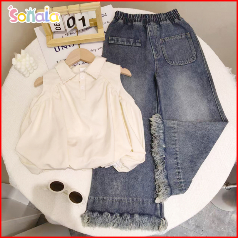 Sonala Setelan Tanpa Lengan Untuk Anak Perempuan Kemeja Celana Jeans Lurus Usia 3-12 Tahun