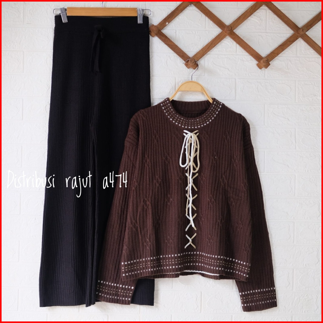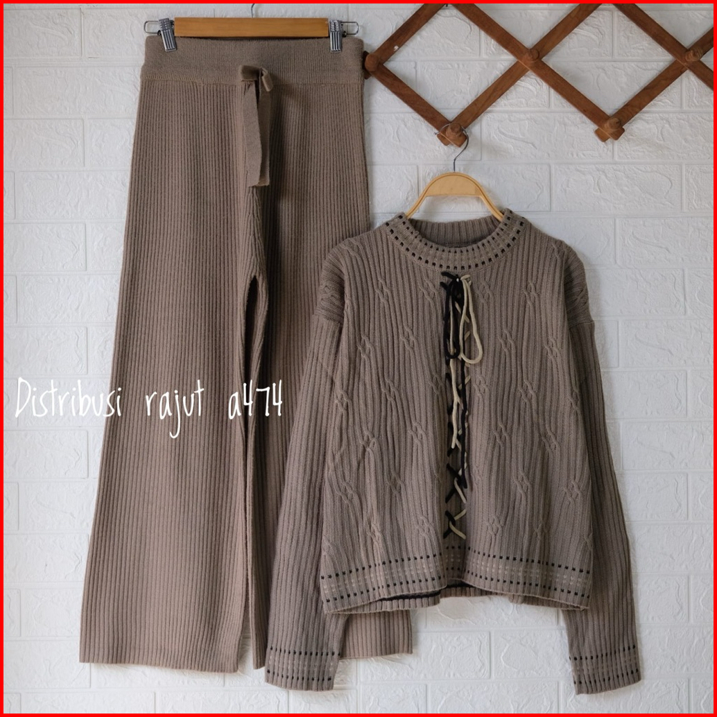 Oneset Maharani Sweater Rajut Motif Pita Depan Setelan Celana Kulot Rajut Wanita