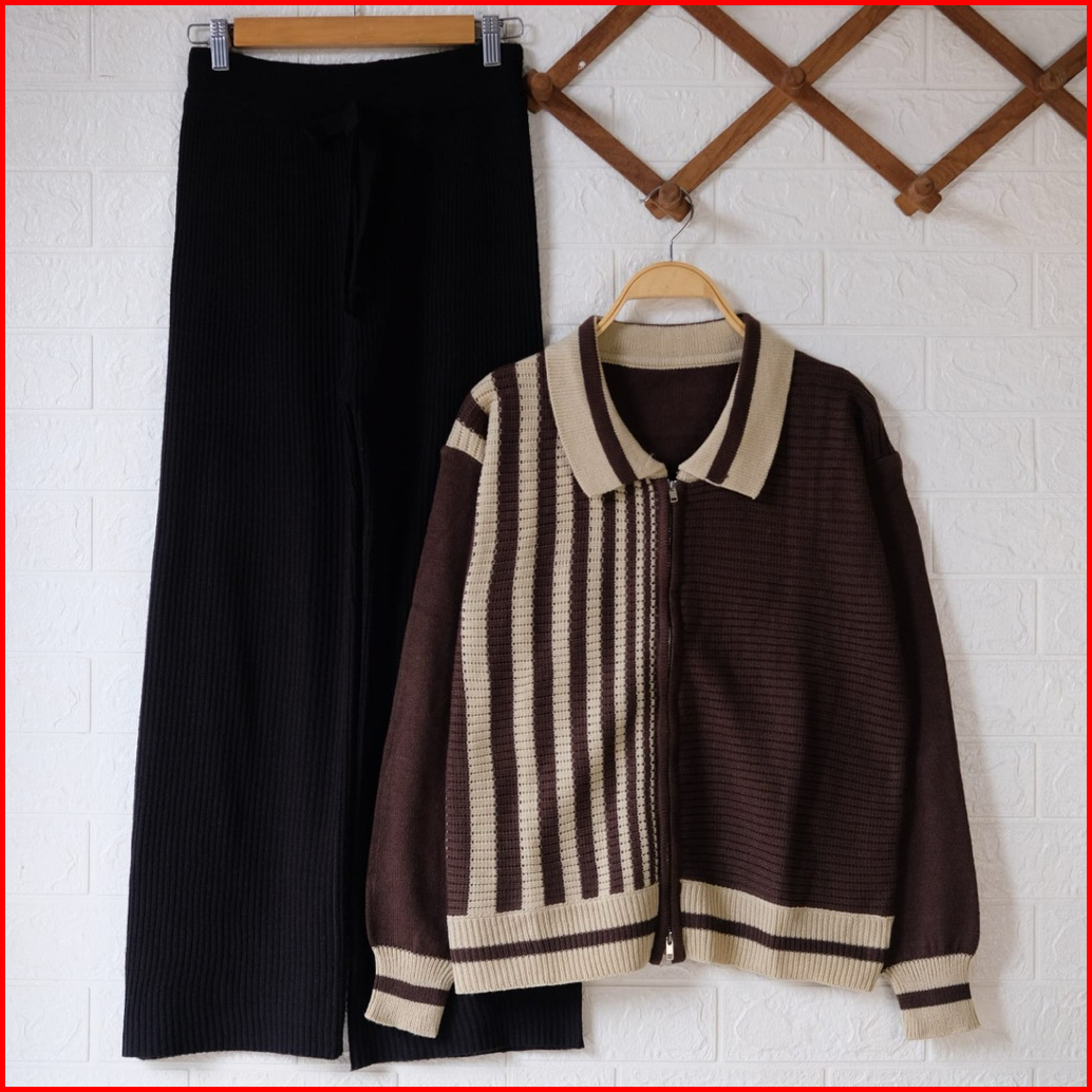 Oneset Jaket Sweater Dua Salwa Setelan Celana Kulot Rajut Wanita