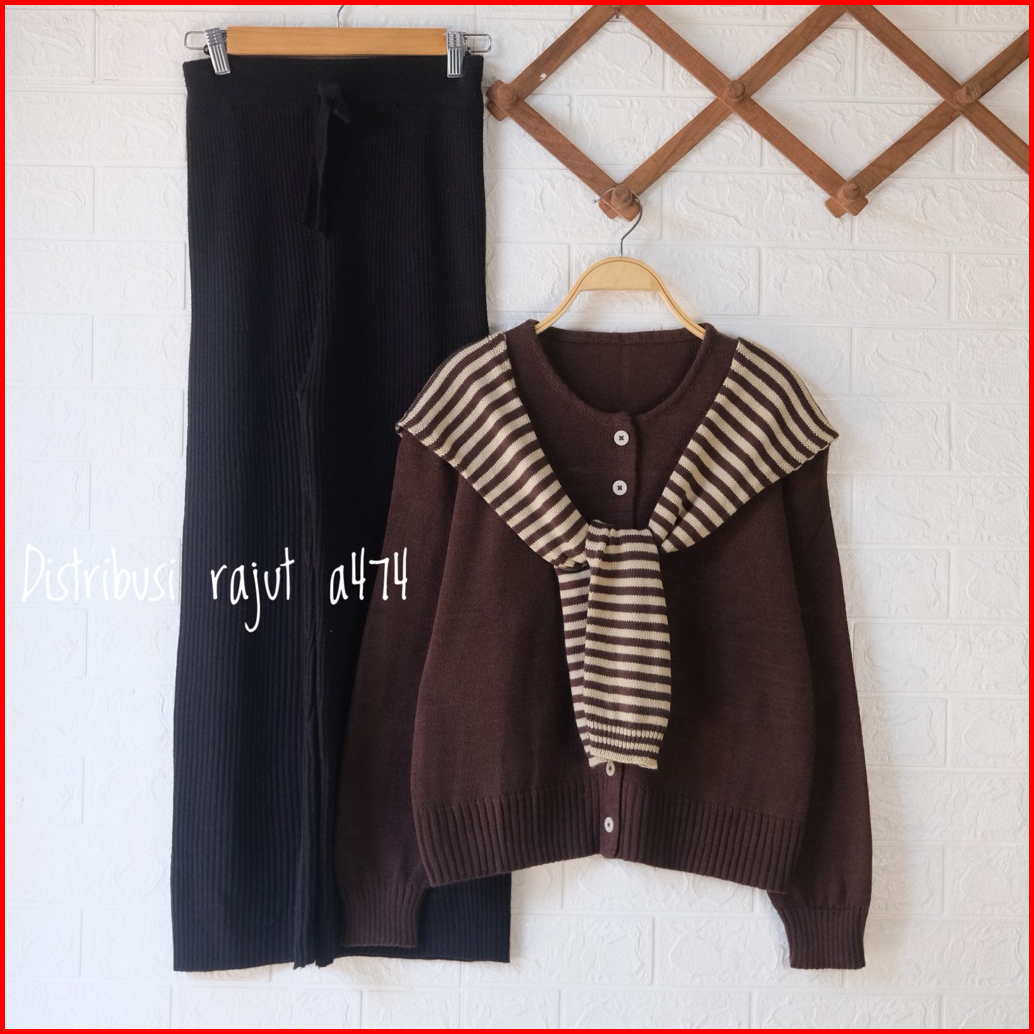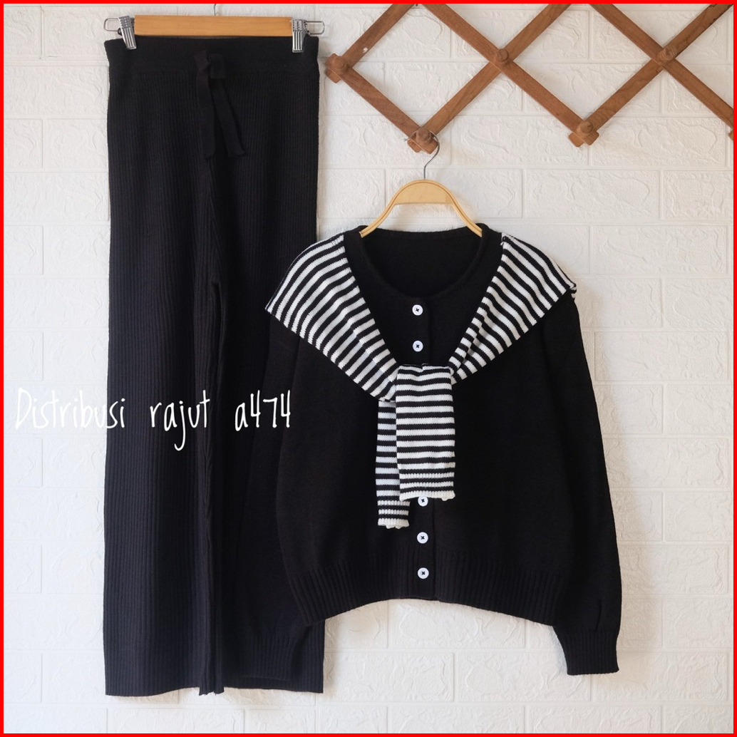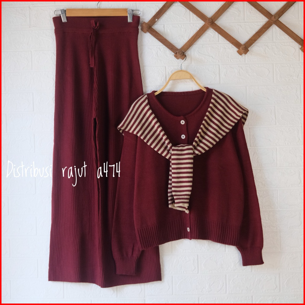 Oneset Almahera Cardigan Rajut Syal Setelan Celana Kulot Rajut Wanita
