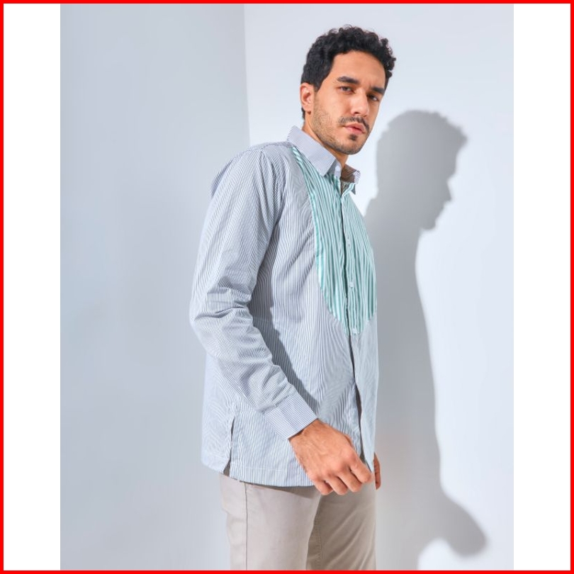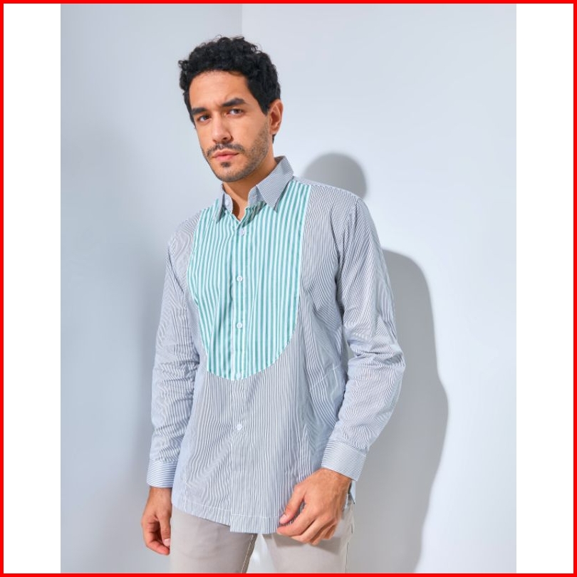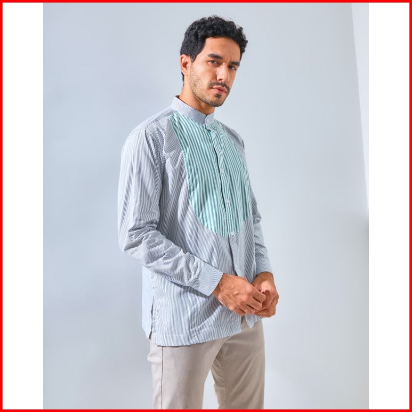 Aldebaran-2in1 Kerah Kemeja Dan Koko Strip Hijau Kombinasi Lengan Panjang Full Katun