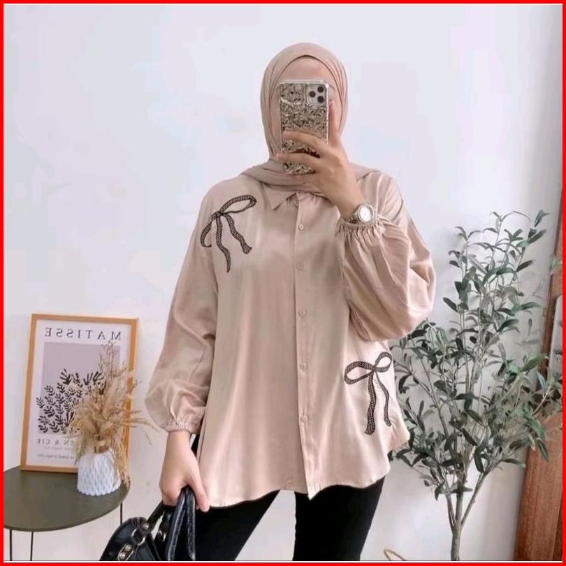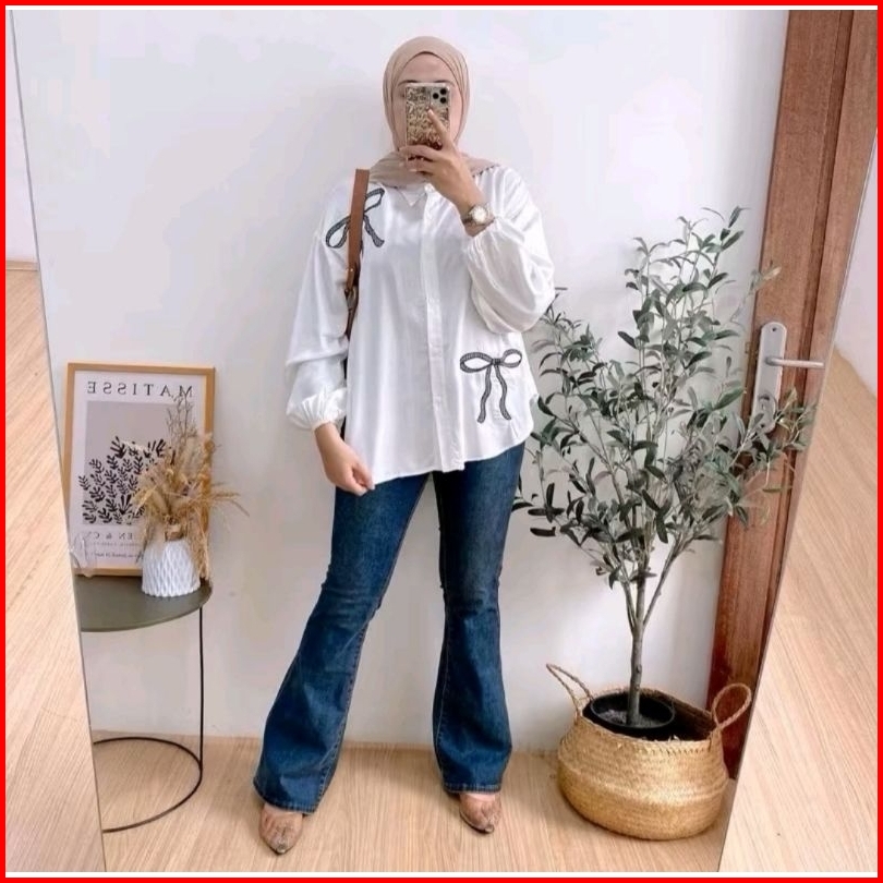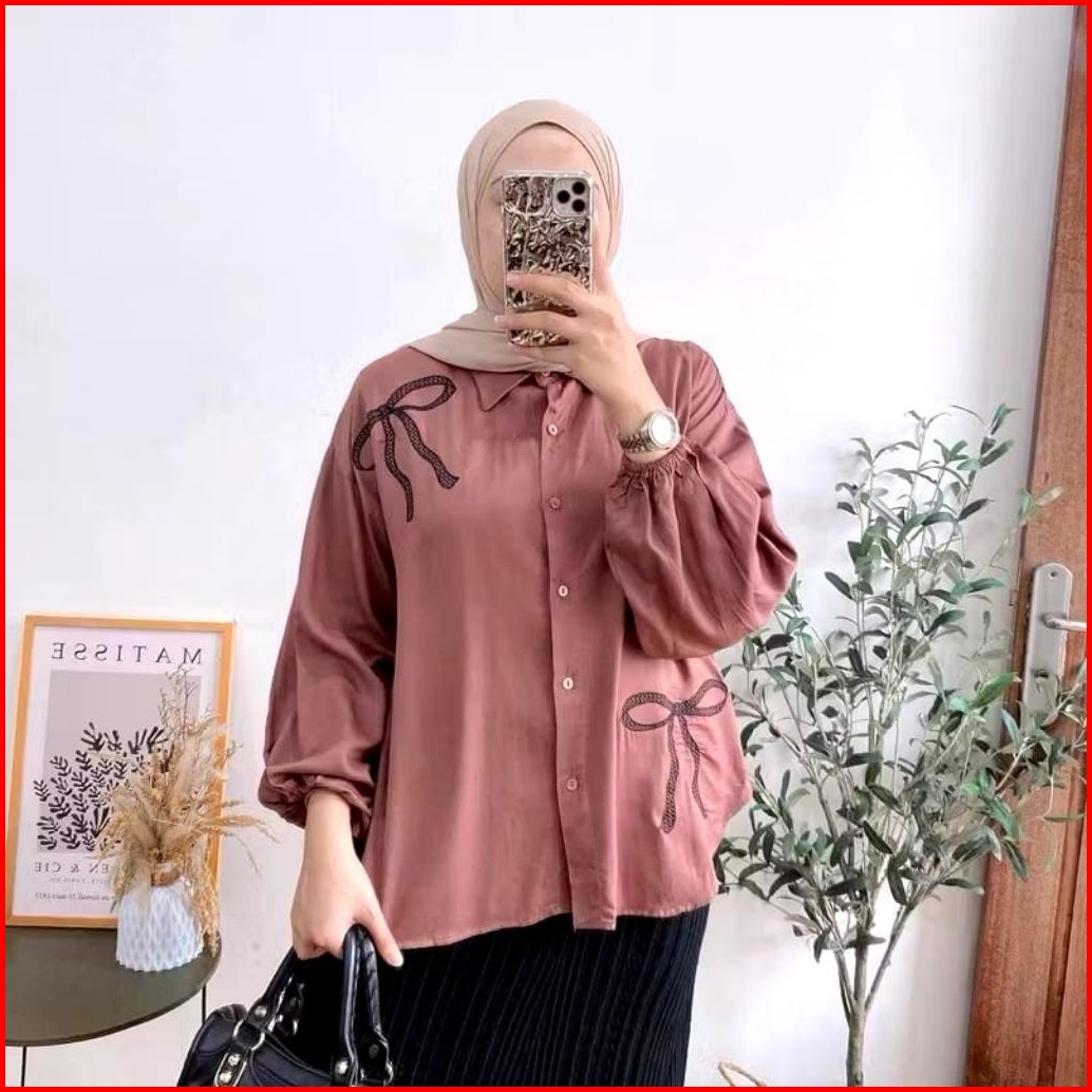 Luna Blouse Atasan Motif Pita Bordir Kemeja Rayon Twill Wanita