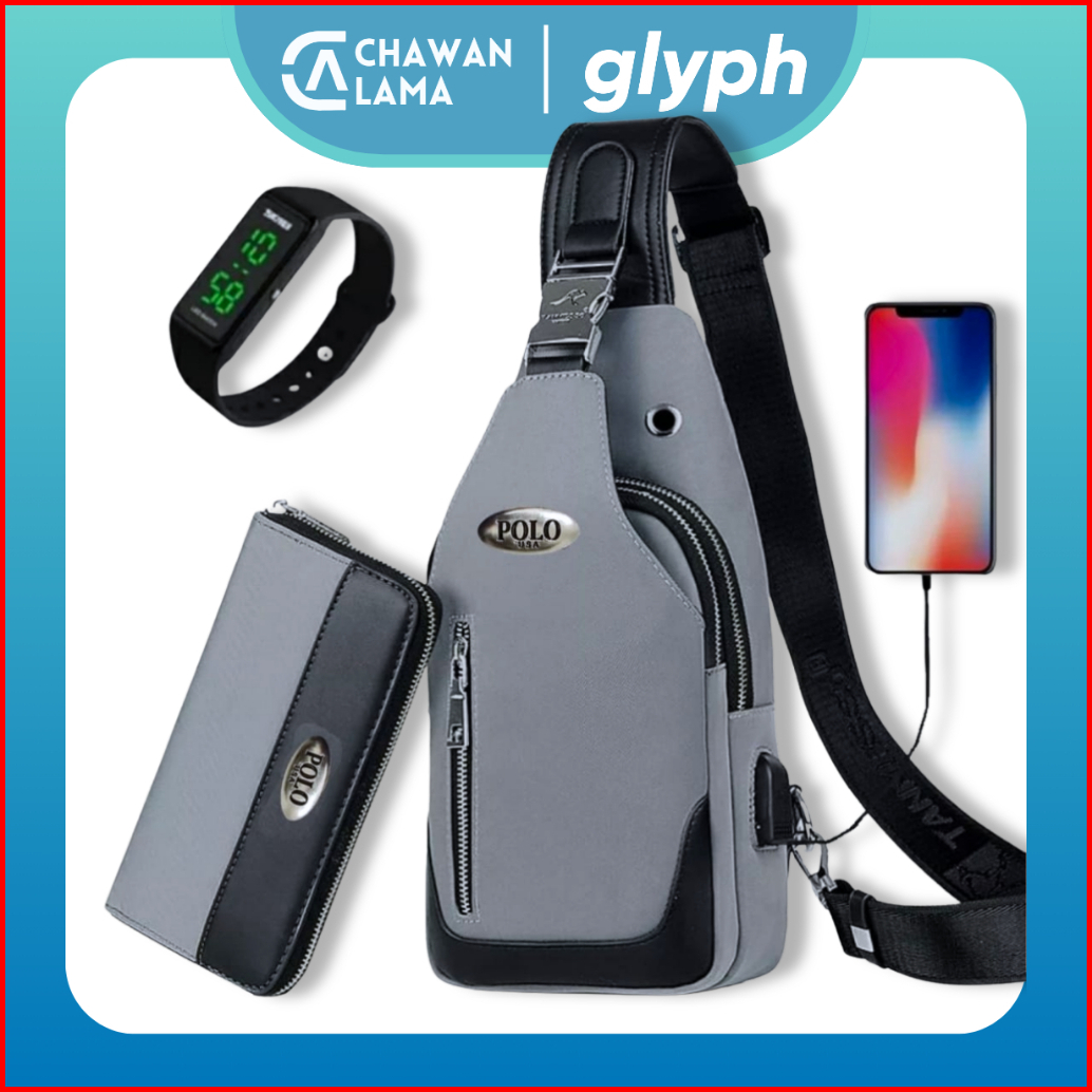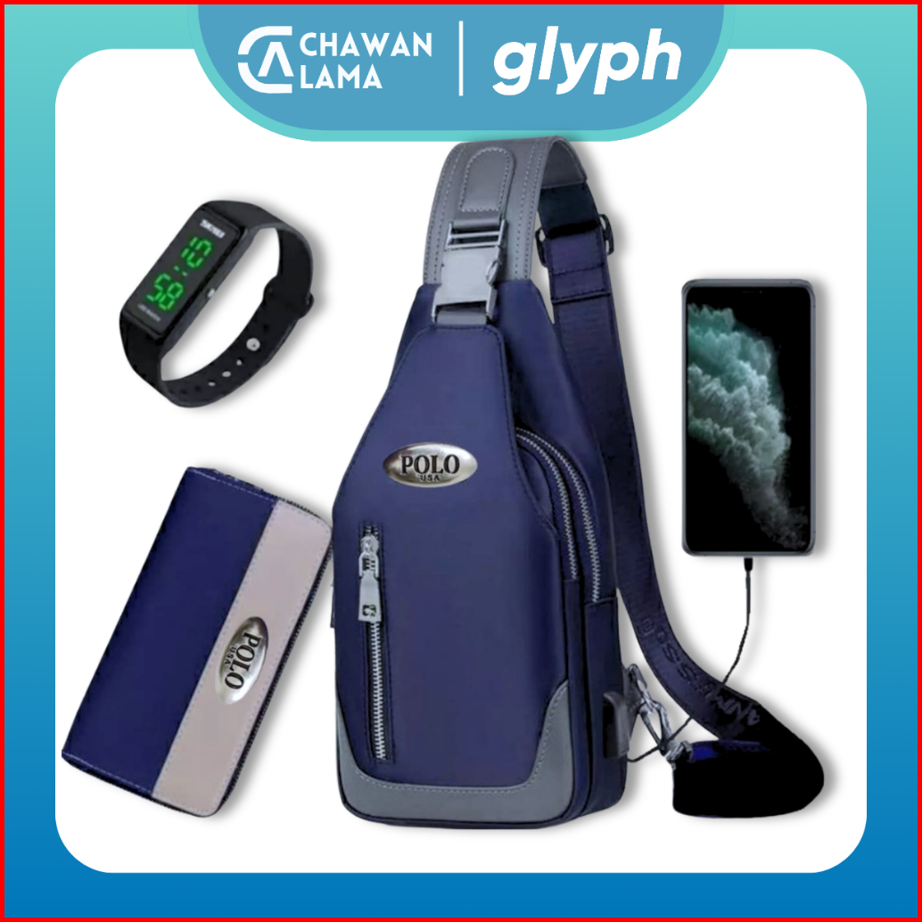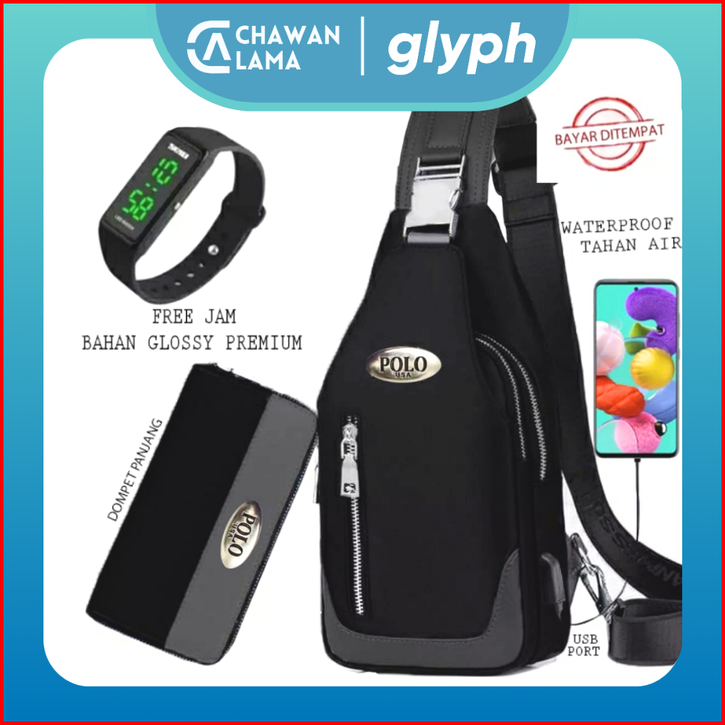 Tas Selempang Pria Waterproof 4in1 Bonus Jam Dompet Usb Port