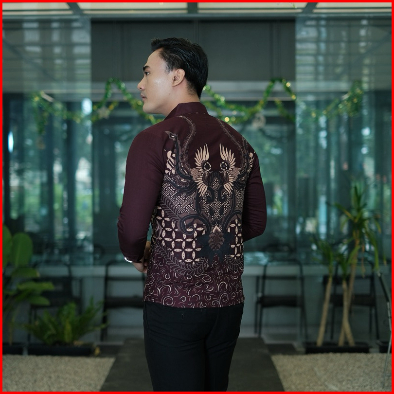 Batik Ningratan Motif Prabuwira Burgundy Maroon Kemeja Batik Pria Lengan Panjang Katun Slimfit Lapis Furing Anak Muda Ke