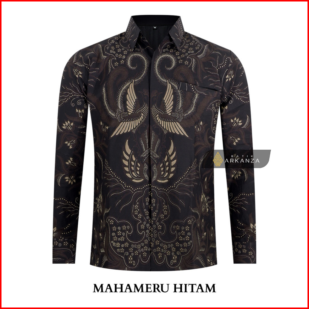 Batik Arkanza Motif Mahameru Hitam Hem Atasan Kemeja Baju Batik Pria Cowok Laki Laki Slimfit Full Lapis Furing Lengan Pa
