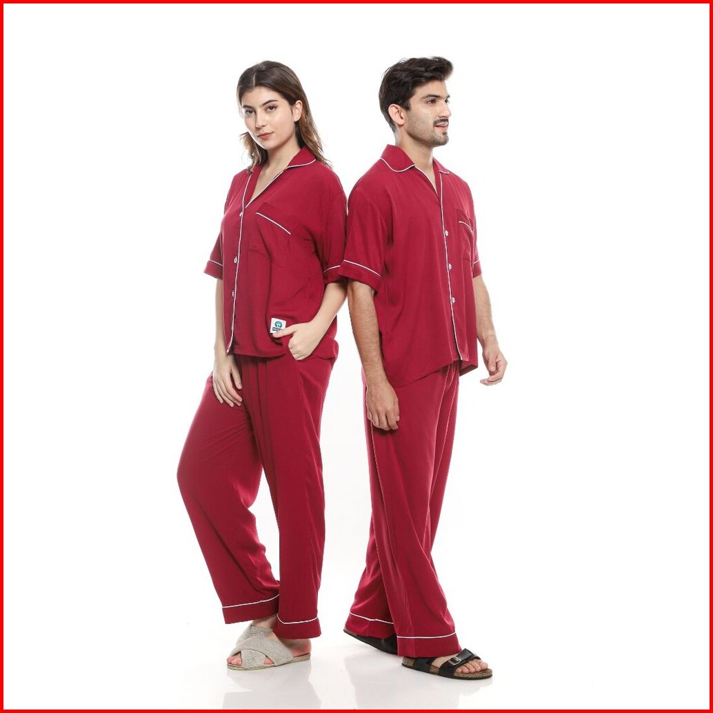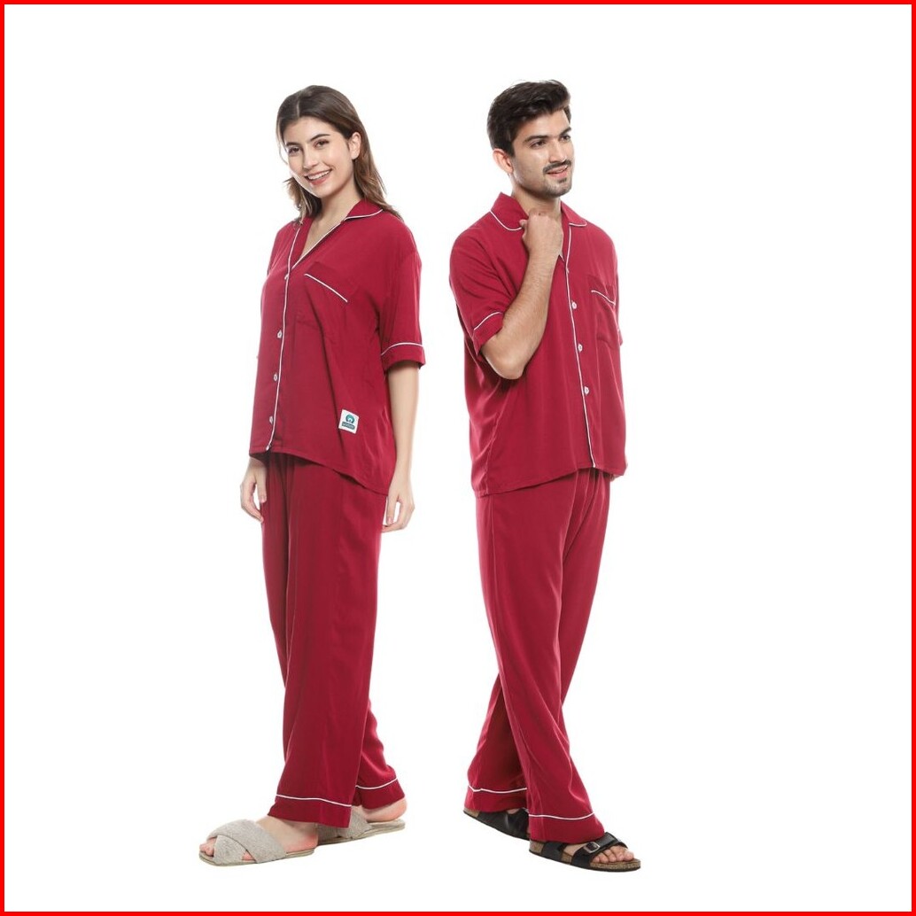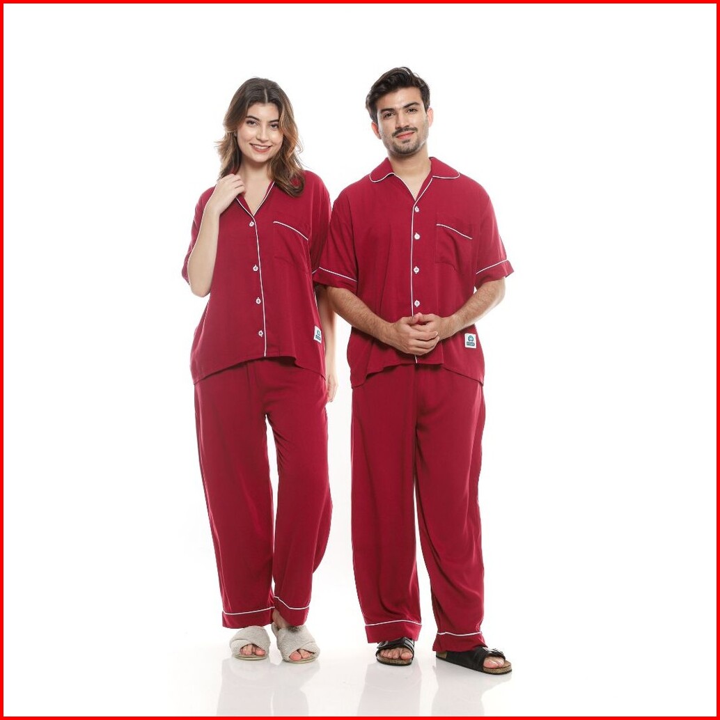 Oncloth Setelan Oneset Baju Piyama Tidur Couple Pria Wanita Jumbo Lengan Pendek Mewah Stylish Maroon