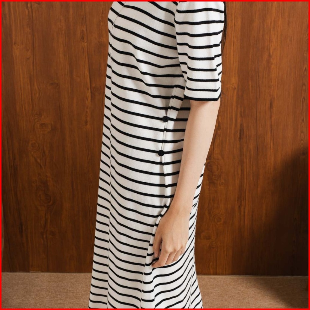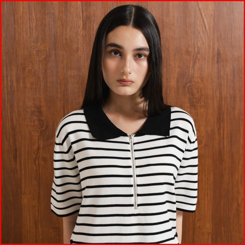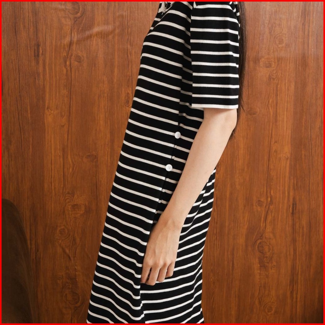 This Is April Gaun Midi Rajut Zipper Wanita Lengan Pendek Evelyn Dress Black Dan White