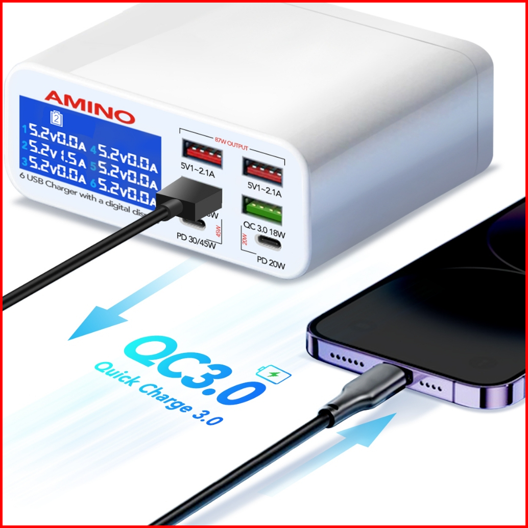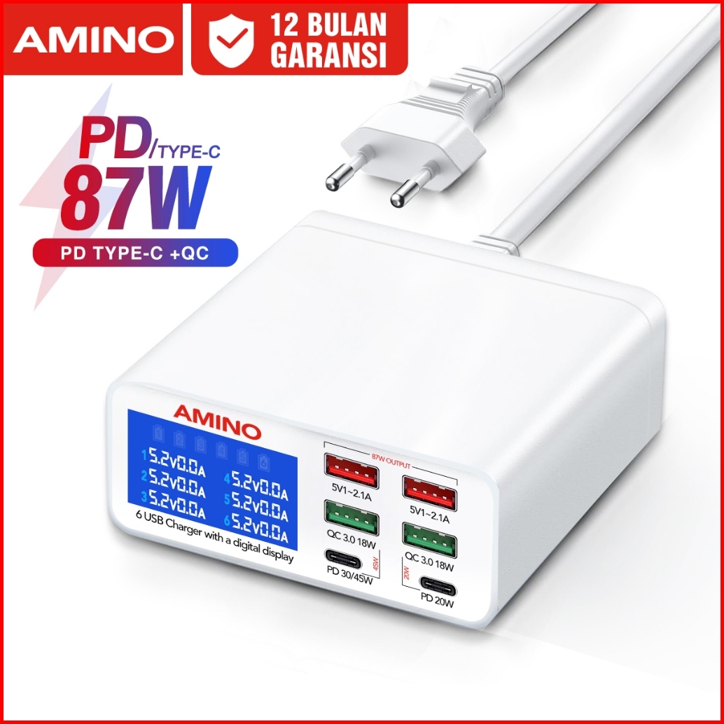 Amino 87w Pd Qc Fast Charger 6 Port Multi Port Charger 4 Usb 2 Type -c Super Fast Charger Led Function Desktop Kepala La