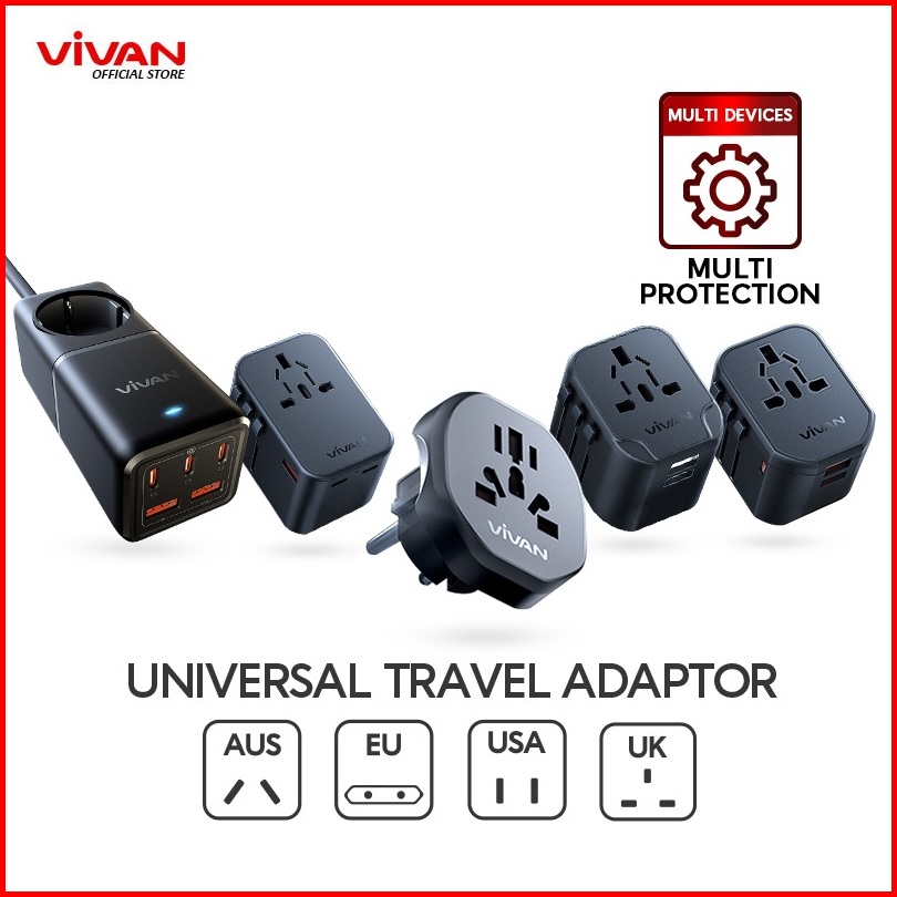 Vivan Vps-t Series Travel Adaptor Fast Charging Gan 75w 5a Universal Adaptor Pd Qc Uk Us Eu Original