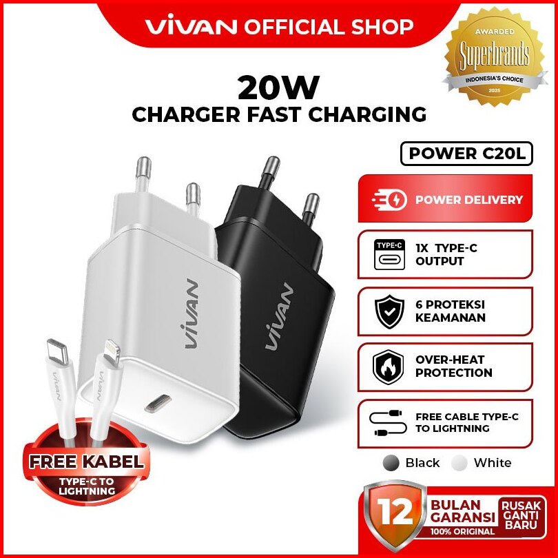 Free Cable Vivan C20 Power Mini Charger Adaptor Kepala Charger For Iphone 17 16 15 14 13 12 11 Type C Samsung Huawei Xia