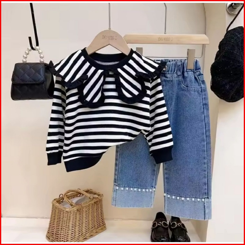 Setelan Anak Perempuan Lucu Usia 1-5 Tahun Atasan Ruffle Salur Cantik Celana Jeans Mutiara Fashion Anak Korean Style Out