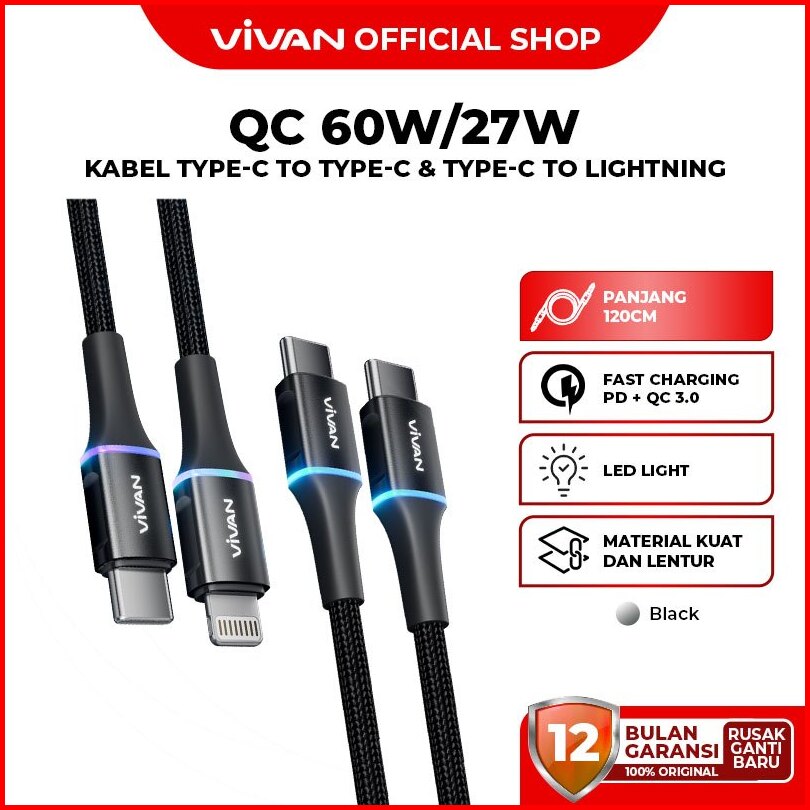 Vivan Kabel Type C To Lightning Type C To Type C 3a Untuk Iphone 14 13 Pro Max 13 12 11 Xs Xr X 8 7 Plus Seri Vdc Vdcl12