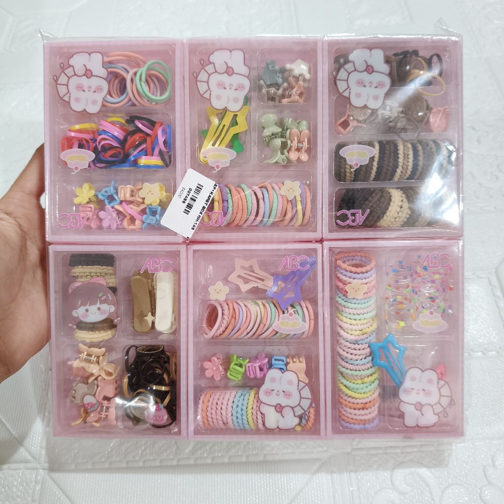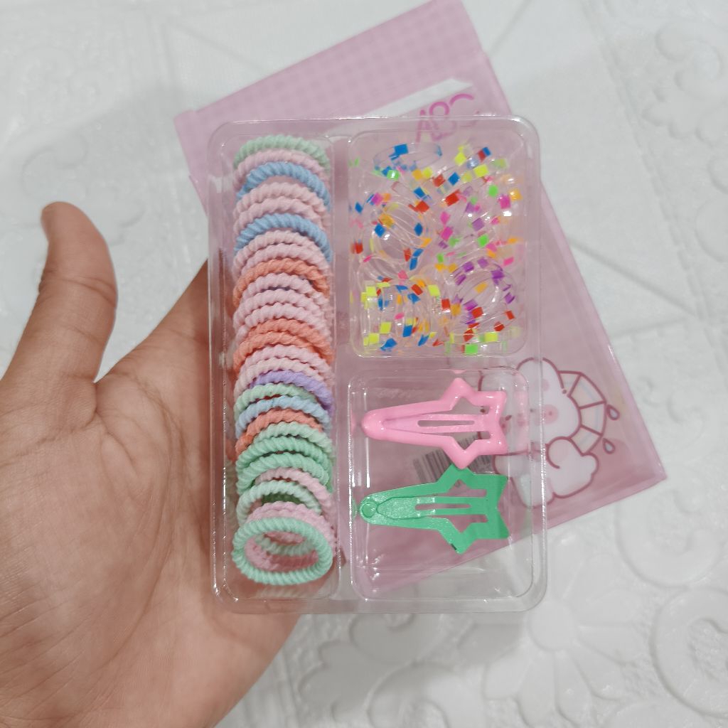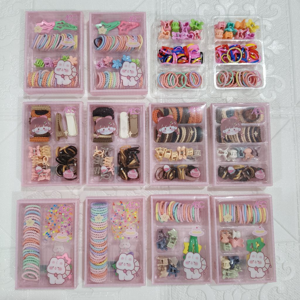 kuncir rambut mini + jepit rambut mini + karet jepang aneka motif dan warna di jual 12 box