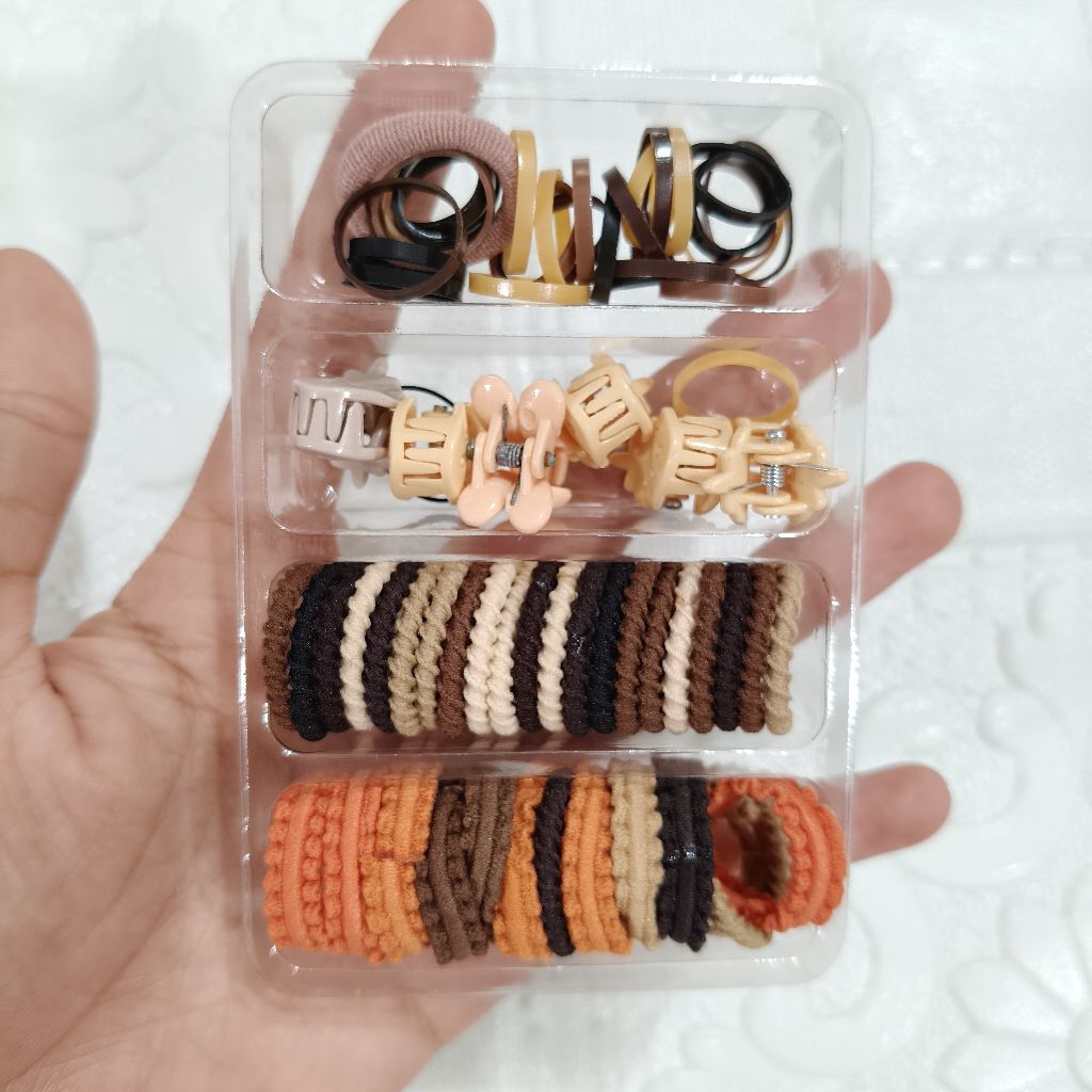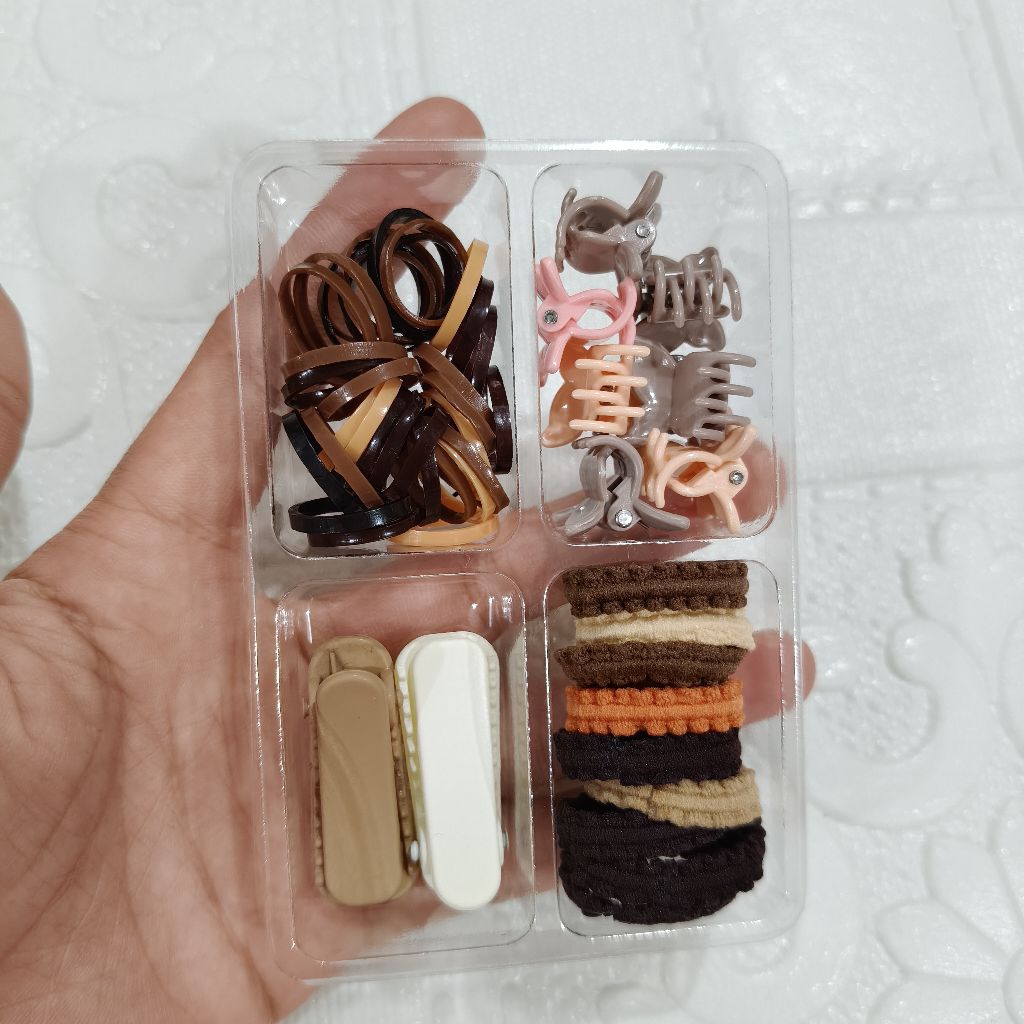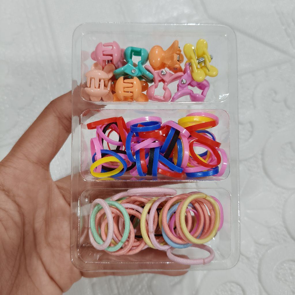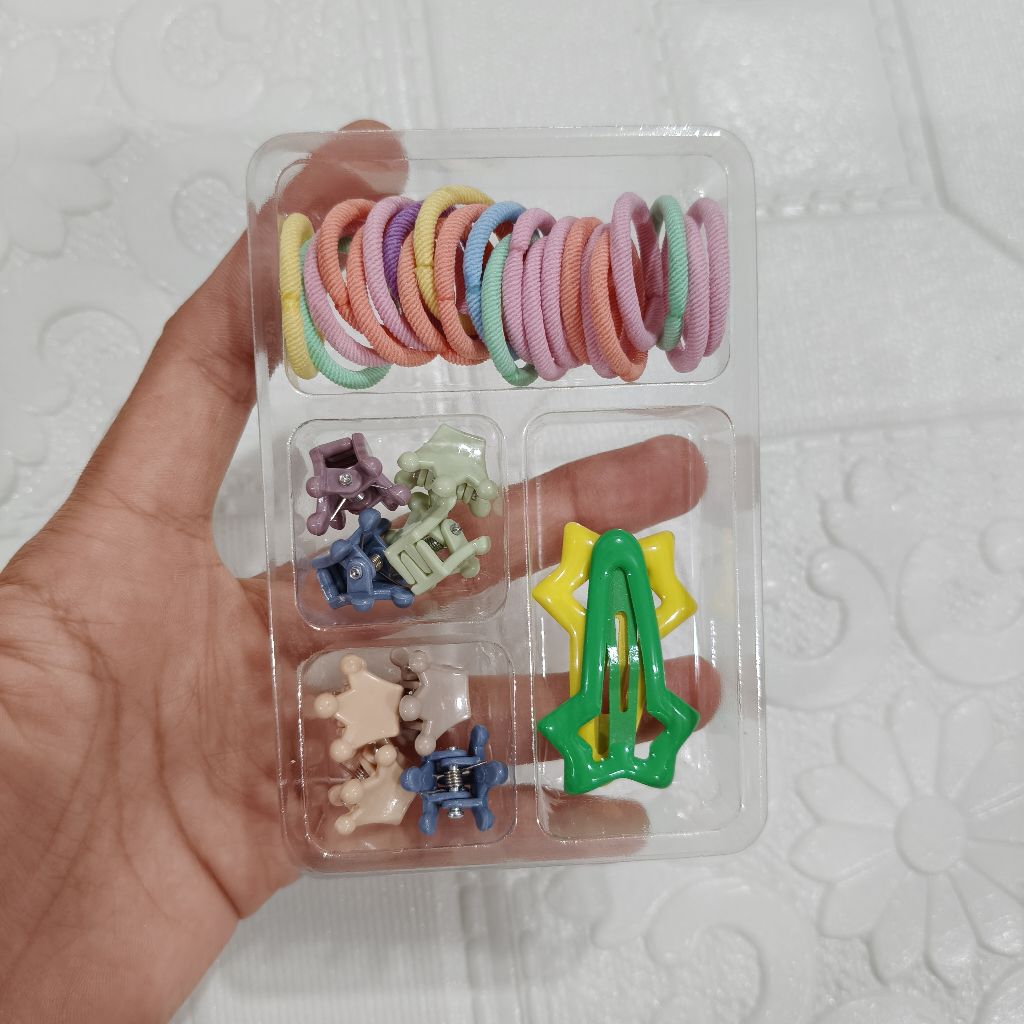 kuncir rambut mini + jepit rambut mini + karet jepang aneka motif dan warna di jual 12 box