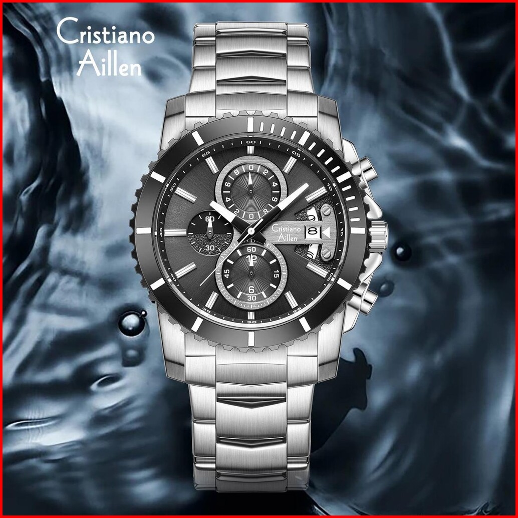 Cristiano Aillen Jam Tangan Pria Analog 8898 Rantai Stainless Steel Chronograph Kaca Sapphire Water Resistant 3 Atm