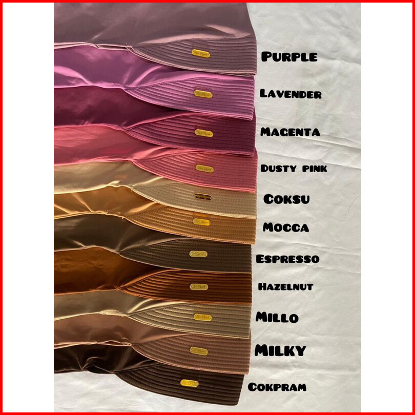 Fanta, Toska, Merah cabai, Kuning, Terakota, Olive, Mauve, Zaitun, Gold, Hitam, Navy, Maroon, Mocca, Coksu, Millo, Magenta, Matca, Avocado, Denim, Lemon, Putih, Dusty, Birel, Hazelnut, Army, Espresso, Milky, Silver, Abutua, Wardah, Coklat tua, Purple, Lavender, Sage, Jotol, Turkis, Salem